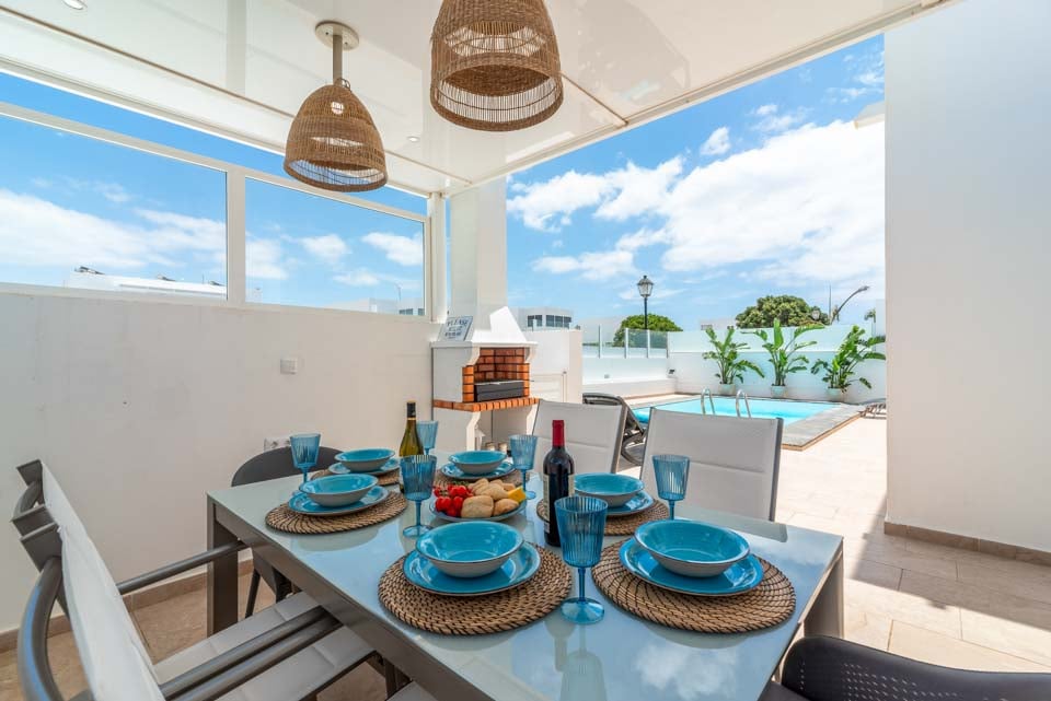De villa beschikt over drie moderne slaapkamers en is voorzien van airconditioning die op munten werkt en voor koele nachten zorgt in de zomermaanden. Een volledig uitgeruste keuken en woonkamer met een smart-tv bieden alles wat u nodig hebt voor uw self-cateringvakantie. Buiten kunt u gebruikmaken van de stenen barbecue en buiten dineren, terwijl u samen met uw dierbaren geniet van de Canarische zon.