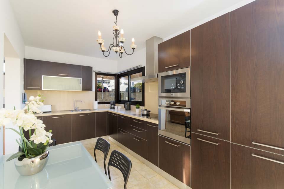 Oven, kookplaat, magnetron, vaatwasser, vriezer, koelkast, koel-vriescombinatie, eetgelegenheid, openslaande deuren