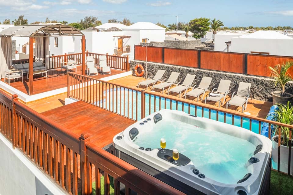 Uw privézwembad ligt boven straatniveau en is een heerlijke plek om van de zon te genieten. Het helderblauwe water is zo verleidelijk dat je er nooit meer uit wilt als je er eenmaal in gedoken hebt! Blijf droog op de ligstoelen bij het zwembad en geniet van een ontspannende tijd in de hitte. Zet uw zonnebril op en lees een boek in uw hand. U bent in een mum van tijd bruin. Vergroot uw ontspanning met een uurtje of twee in uw eigen hottub, de beste plek om de schemering door te brengen met een koel drankje in de hand.