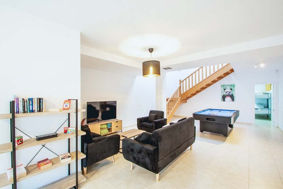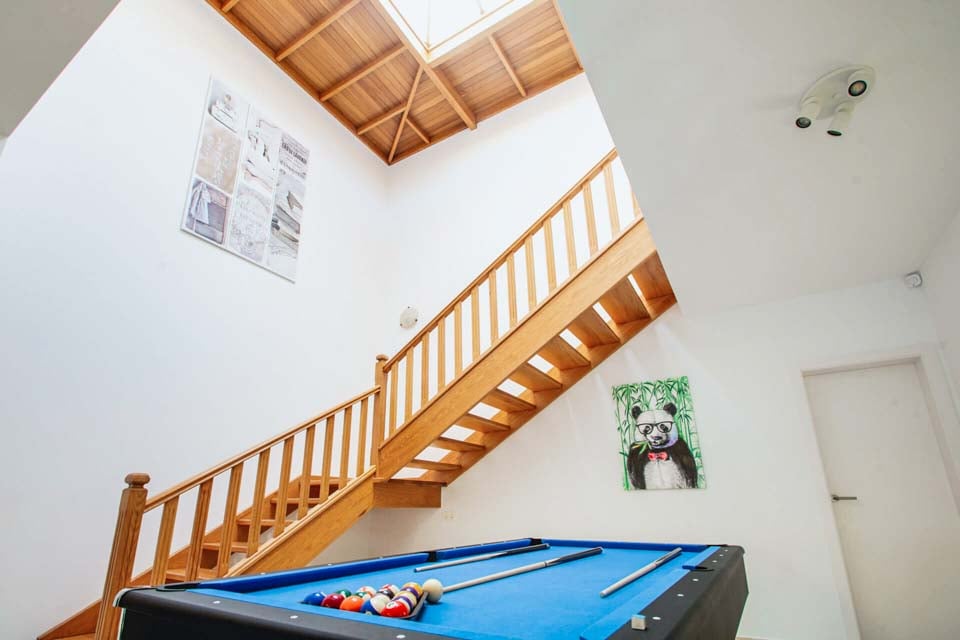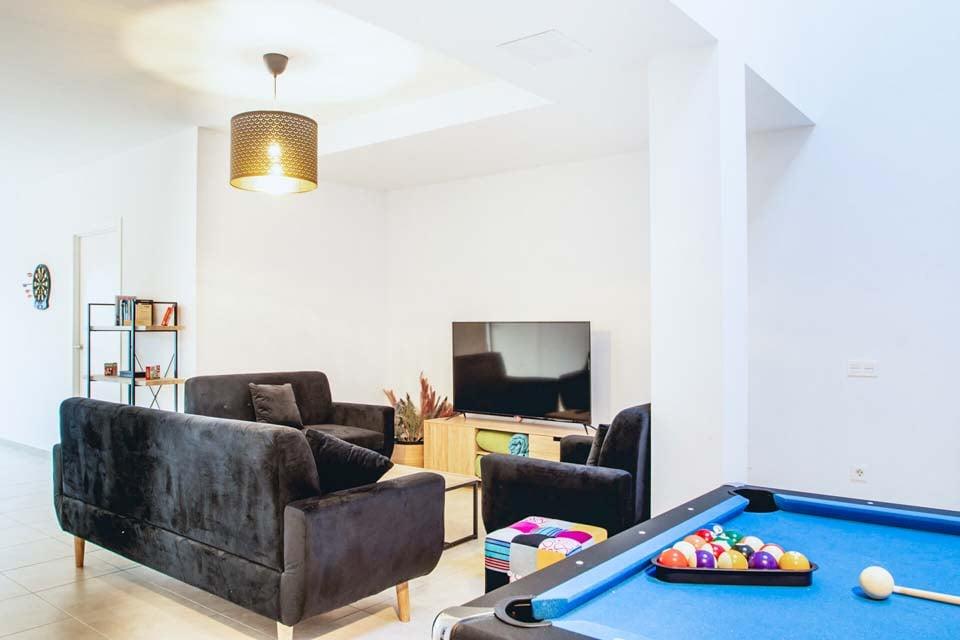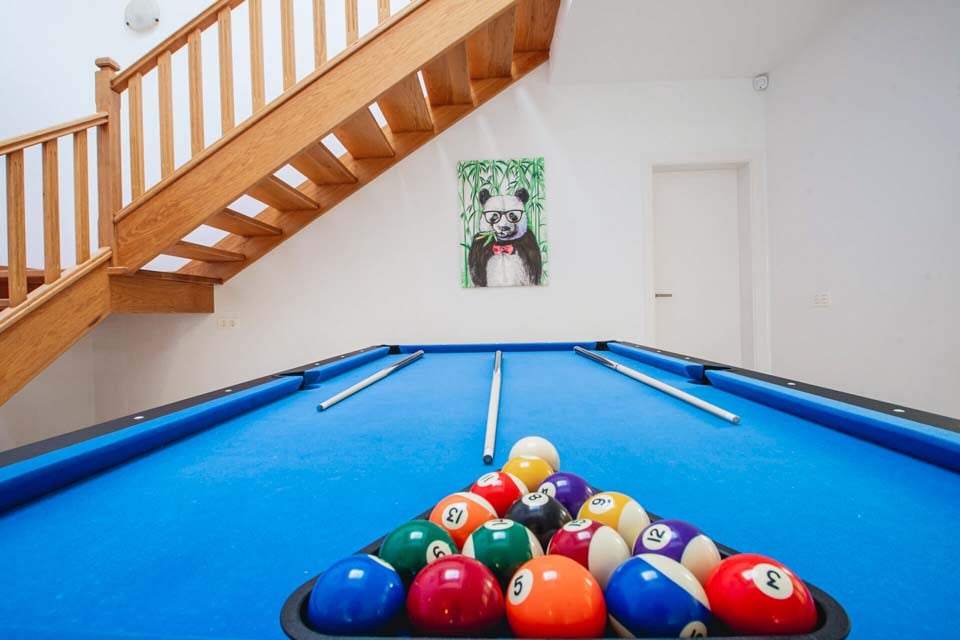 Comfortabele zithoek, smart-tv, pooltafel, bureau, openslaande deuren, dartbord