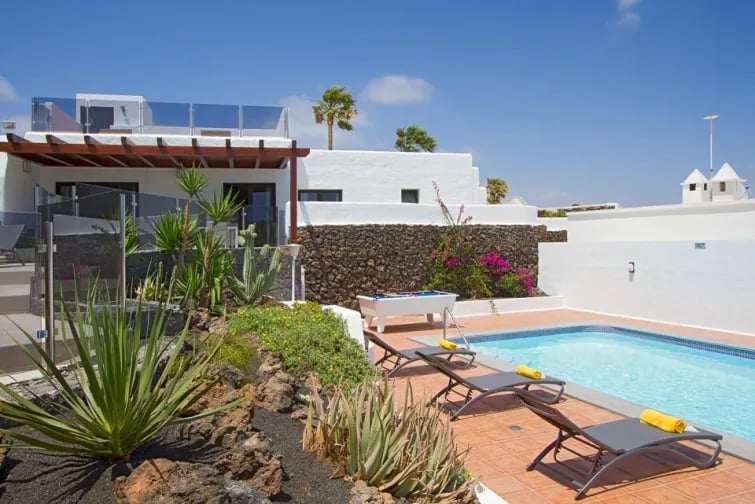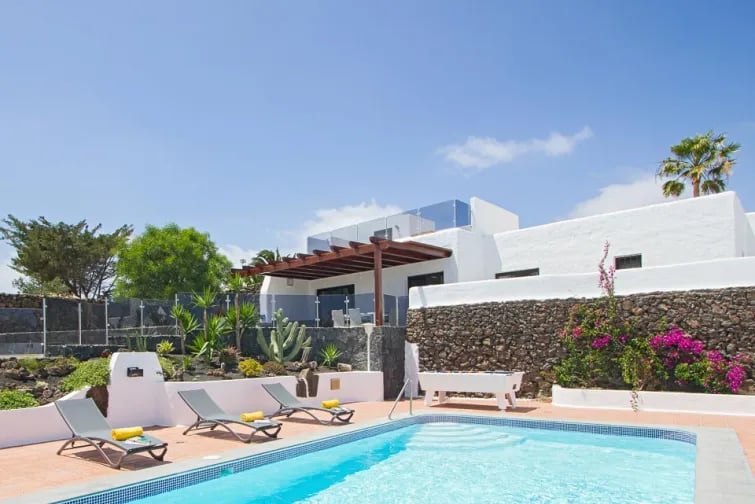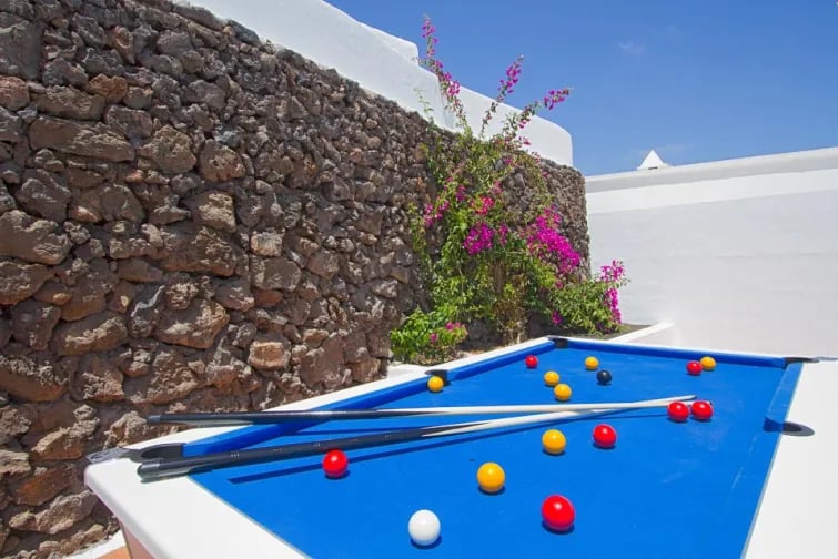 Mirador Mojones ligt, zoals de naam al doet vermoeden, in het hart van de exclusieve, luxe wijk Los Mojones en gunstig gelegen nabij het resortcentrum en de oude binnenstad van Puerto del Carmen. De villa is zorgvuldig en smaakvol ingericht om gasten een perfecte vakantie-ervaring te bezorgen. Het is handig dat alles op één niveau is gelegen. Alle vier de slaapkamers hebben een inloopdouche en een eigen badkamer. De woonkamer beschikt over internet-tv, een iPod-dock en een moderne keuken met eetgelegenheid. Eén van de belangrijkste kenmerken van Mirador Mojones is de wenteltrap vanuit de woonkamer naar een gemeubileerd dakterras met een panoramisch uitzicht op de zee, het resort en de bergen. Vanuit de woonkamer komt u op de overdekte pergola met een rotan hoekbank, een eettafel en een barbecue aan de zijkant. Een helling met glazen balustrades leidt naar uw privézwembad (verwarming inbegrepen in de wintermaanden) en er staat een pooltafel aan de zijkant. Voor deze villa heeft u geen auto nodig. Zowel het belangrijkste resort Puerto del Carmen als de oude stad zijn in minder dan 10 minuten lopen te bereiken.