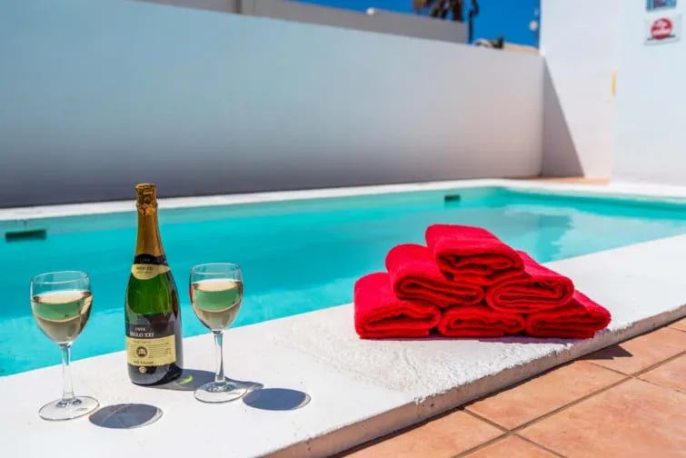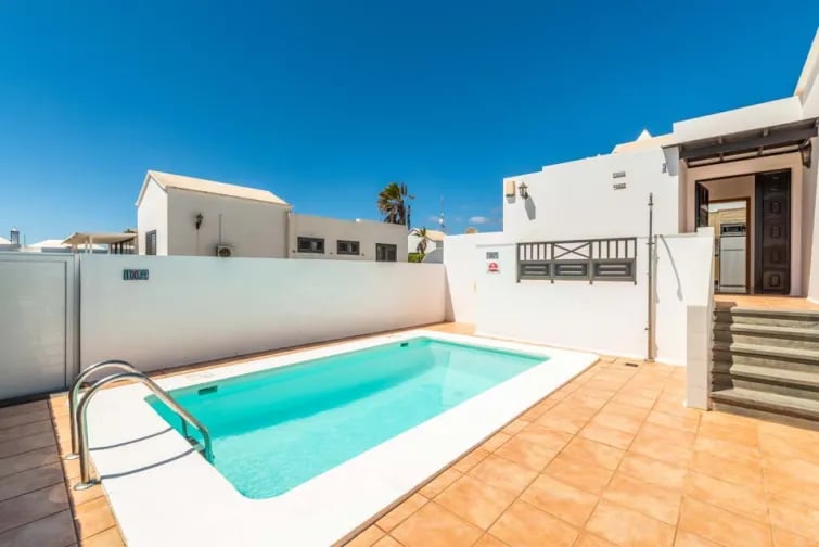 Villa Nancy ligt aan de rand van het indrukwekkende Los Mojones-gebied op Lanzarote in de badplaats Puerto del Carmen. Een rustige wandeling van 15 minuten brengt u naar het hart van alles wat dit resort te bieden heeft. Op een steenworp afstand vindt u drukke bars, souvenirwinkels en prachtige stranden. Dit al lang bestaande resort ligt in het zuidelijke deel van het eiland en op slechts 10 minuten rijden van de luchthaven van Arrecife. Villa Nancy is dus een ideale uitvalsbasis voor wie niet ver wil reizen. Zoals veel resorts was Puerto del Carmen oorspronkelijk een klein vissersdorpje. De haven is nog steeds het centrum, met prachtige boten en uitstekende restaurants die verse vis serveren. Laten we onze aandacht eens richten op deze prachtige villa. We vonden het heerlijk om buiten te kunnen eten onder een overdekt terras met houten balken. De stenen barbecue is ideaal om buiten te koken. Als u geen zin heeft om te koken, kunt u heerlijk ontspannen op een van de vele ligstoelen of een duik nemen in het zwembad en gebruikmaken van de zwembadverwarming* (gratis van november tot en met mei). Vanuit het overdekte terras bereikt u via openslaande deuren de loungehoek met comfortabele stoelen, een flatscreen-tv, een complete Britse zenders, een dvd-speler en een eettafel. Vanuit de woonkamer komt u in de lange gang, vanwaar u toegang heeft tot alle overige kamers. Er is een volledig uitgeruste keuken, een bijkeuken met een wasmachine en drie slaapkamers. Eén slaapkamer heeft twee eenpersoonsbedden, de andere twee hebben een tweepersoonsbed. Voor uw comfort zijn ze allemaal voorzien van airconditioning. De hoofdslaapkamer heeft een eigen badkamer met dubbele wastafels. De overige twee kamers delen een aparte familiebadkamer.