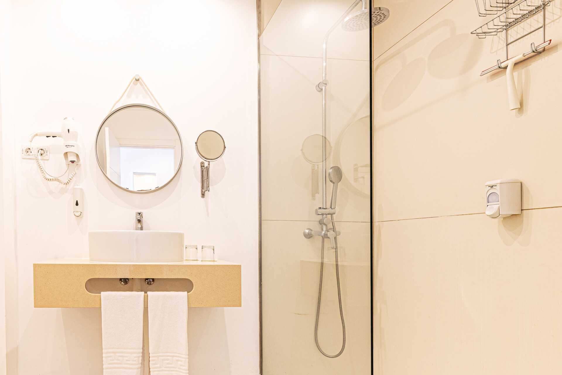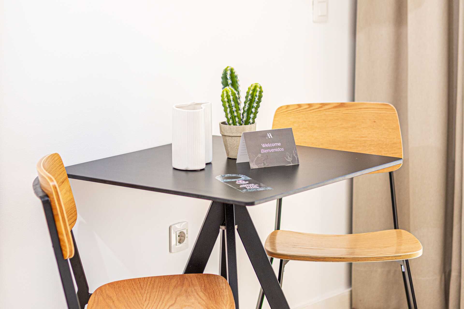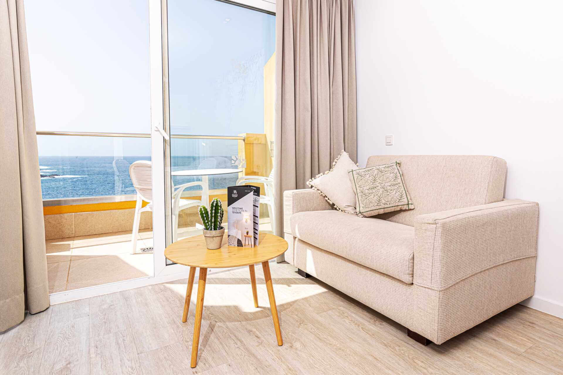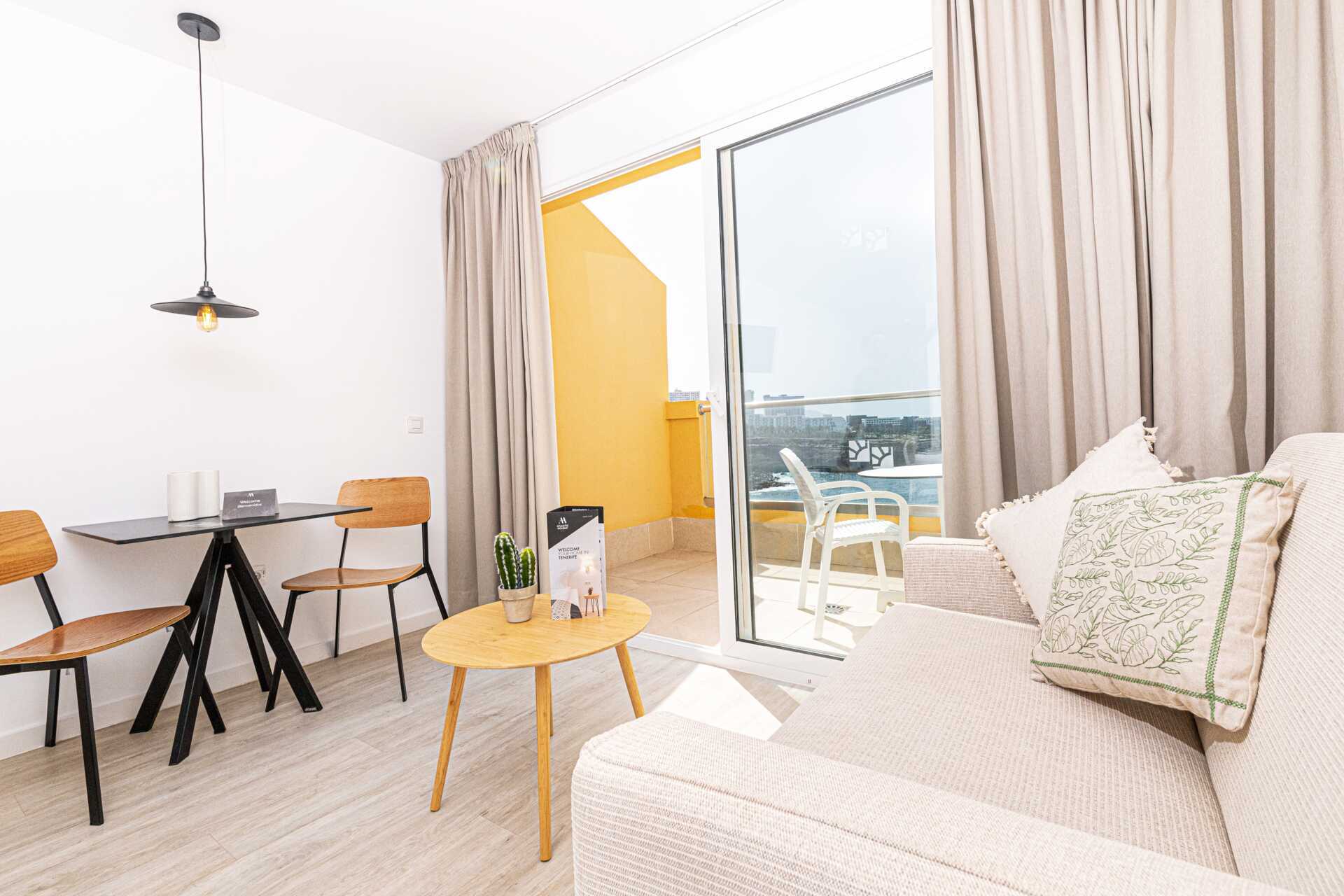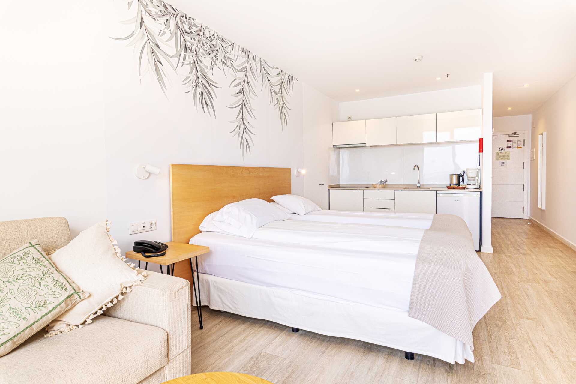 Studio met balkon of grondterras en uitzicht op zee. Gecombineerde slaapkamer en mini-keuken. Een tweepersoonsbed of twee eenpersoonsbedden. Mogelijkheid van extra bed op slaapbank. Minikeuken met koelkast, kookplaten, waterkoker, koffiezetapparaat, broodrooster en basis keukengerei. Sommige appartementen hebben een lage scheidingswand. Wifi is inbegrepen. Kluisje tegen betaling. Tv met internationale zenders. Föhn. Badkamer met douche en toilet. Schoonmaak 5 keer/week.