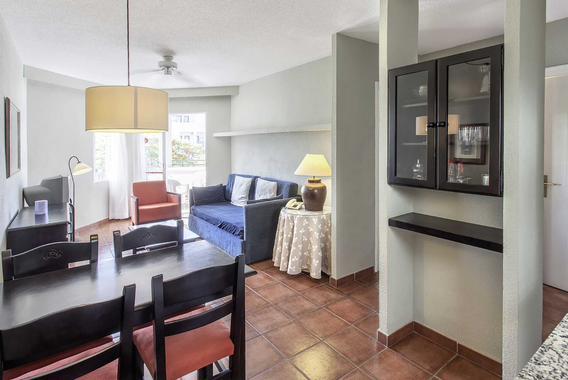 Appartement met één slaapkamer, balkon of terras en uitzicht op het zwembad. De appartementen bevinden zich in een gebouw met zes verdiepingen en een lift. Slaapkamer gecombineerd met kitchenette. Een tweepersoonsbed of twee eenpersoonsbedden. Minikeuken met koelkast, kookplaten, combi-oven en magnetron, waterkoker, broodrooster en basiskeukengerei. Wifi en kluis tegen betaling. Er is een plafondventilator in de slaapkamer. Tv met internationale zenders. Föhn. Badkamer met bad of douche en toilet. Schoonmaak 5 keer/week.