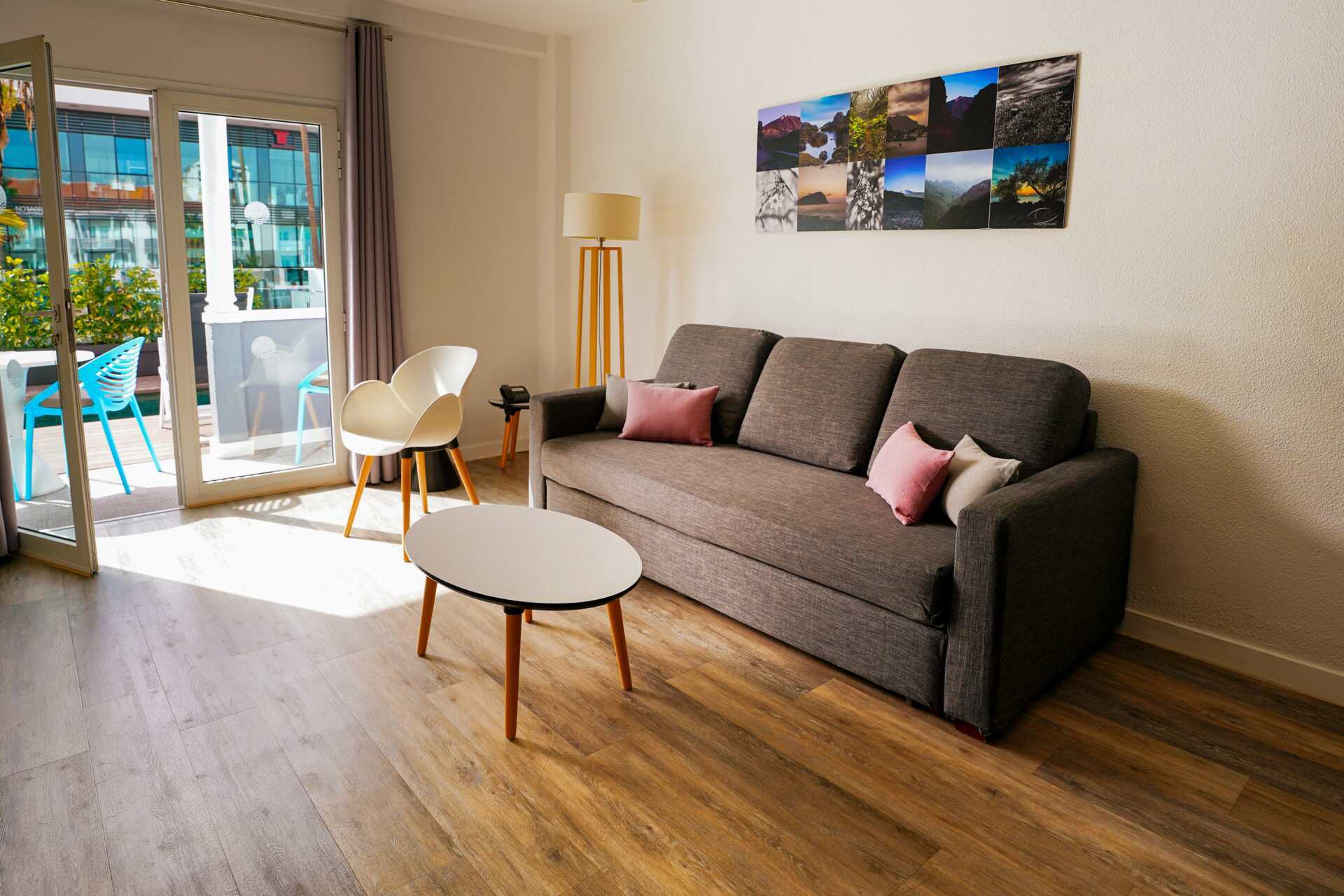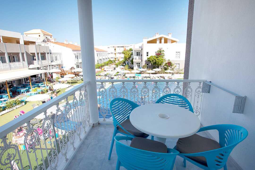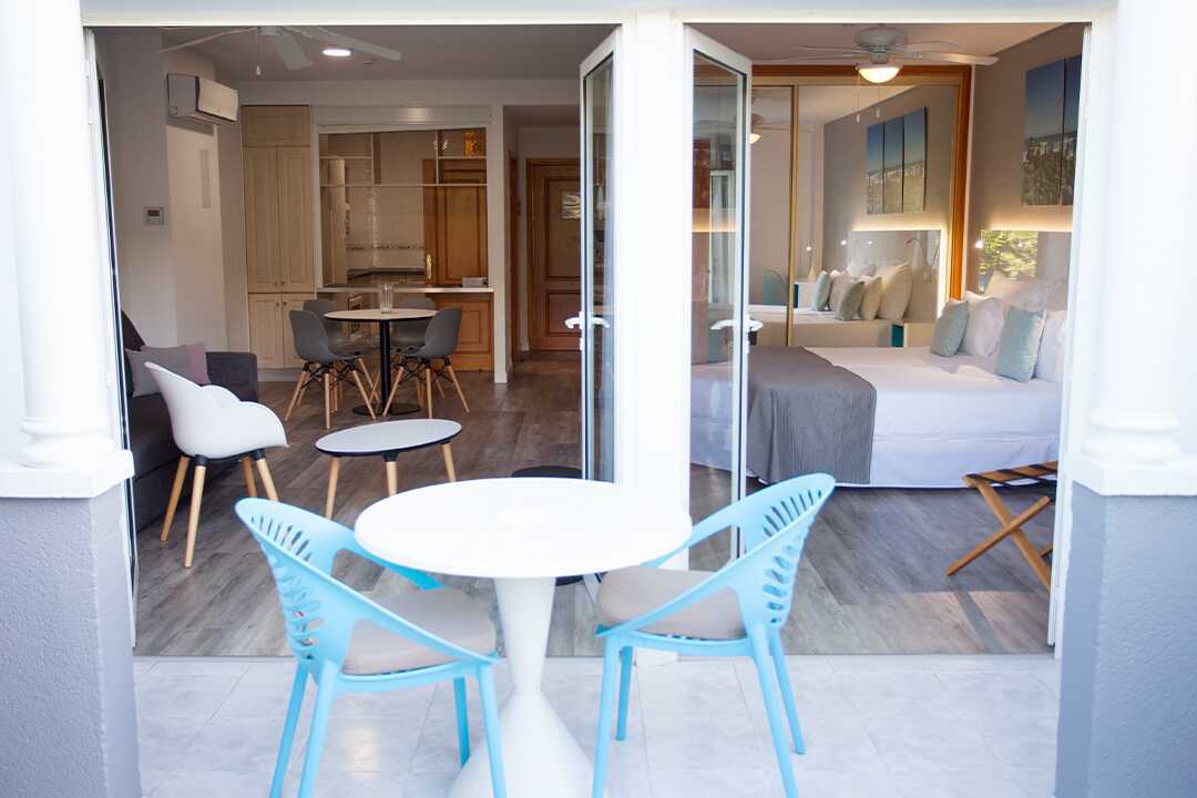 Tweekamerappartement met balkon of terras, sommige met uitzicht op het zwembad of de golfbaan. Slaapkamer en gecombineerde woonkamer met kitchenette. In de woonkamer is er een trap die nergens heen leidt. Bij de receptie is een hek/hek te leen om te voorkomen dat kinderen de trap oplopen. Twee eenpersoonsbedden. Mogelijkheid voor een extra bed op de slaapbank. Minikeuken met koelkast, oven, kookplaat, broodrooster, waterkoker, koffiezetapparaat en eenvoudige keukenapparatuur. Wifi en kluis tegen betaling. Plafondventilator. Tv met internationale zenders. Föhn. Badkamer met douche en toilet. Schoonmaak 5 keer/week.