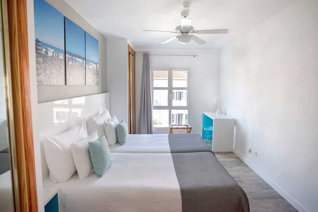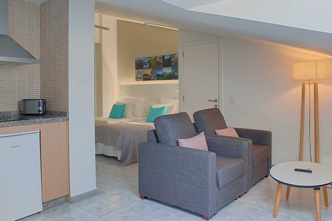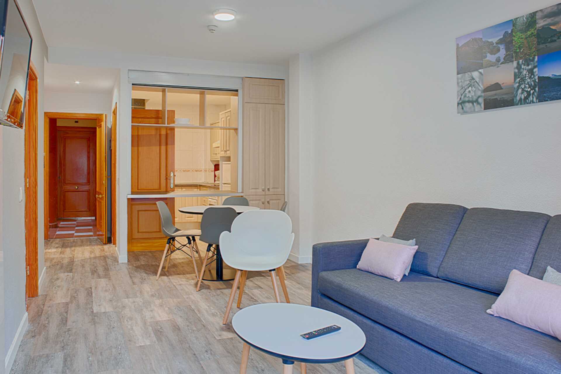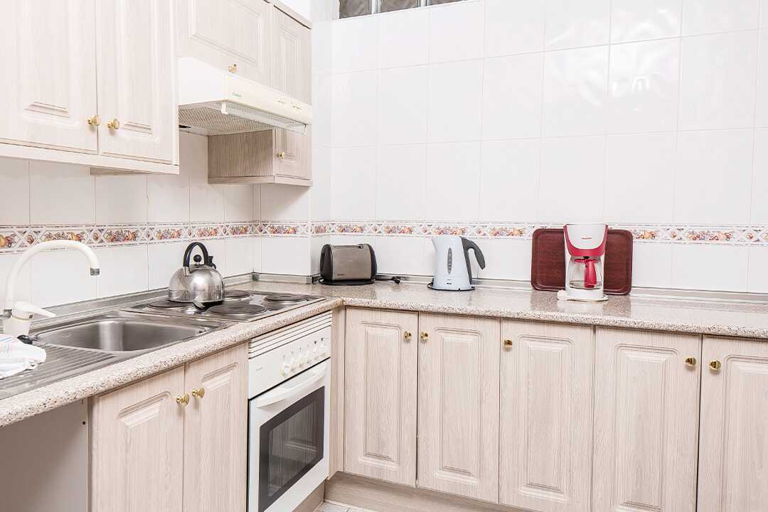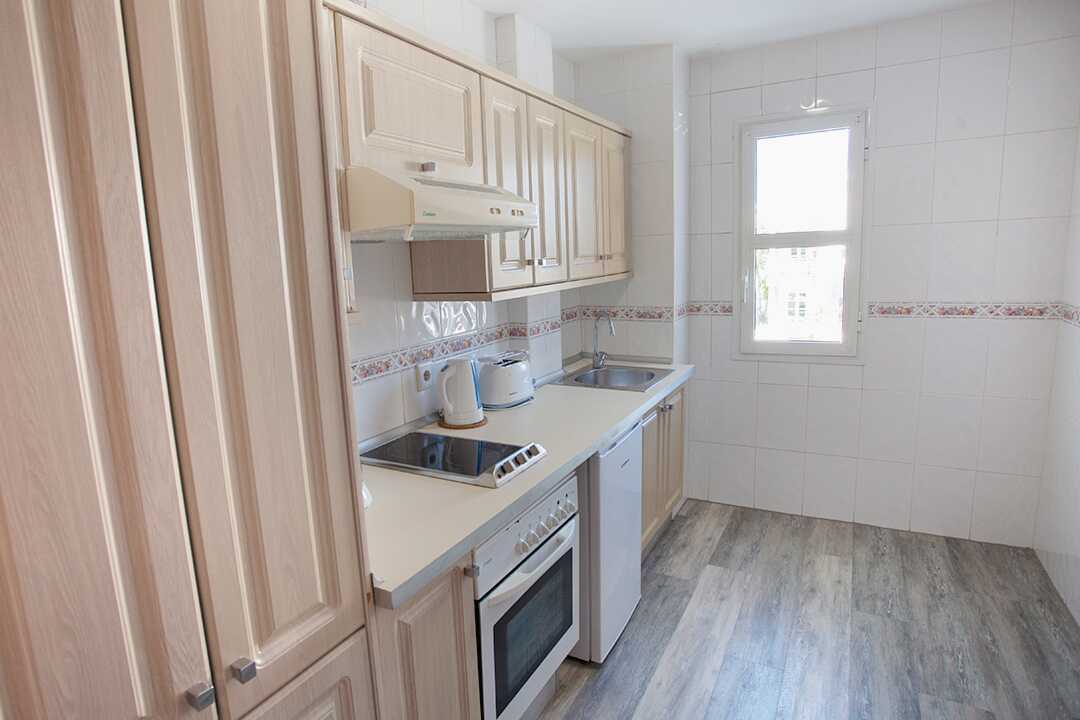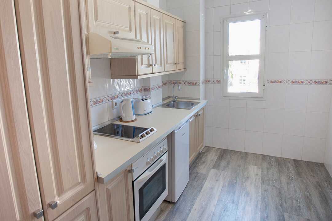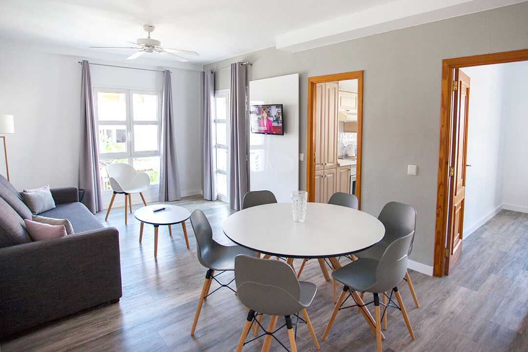 Driekamerappartement met balkon of terras. Twee slaapkamers en een gecombineerde woonkamer met keuken. Twee slaapkamers met twee éénpersoonsbedden in elke kamer. Er is de mogelijkheid om een extra bed toe te voegen op de slaapbank. Minikeuken met koelkast, oven, kookplaten, broodrooster, waterkoker, koffiezetapparaat en basiskeukengerei. Wifi en kluisje tegen betaling. Plafondventilator. Tv met internationale zenders. Föhn. Badkamer met bad en toilet. Schoonmaak 5 keer/week.
