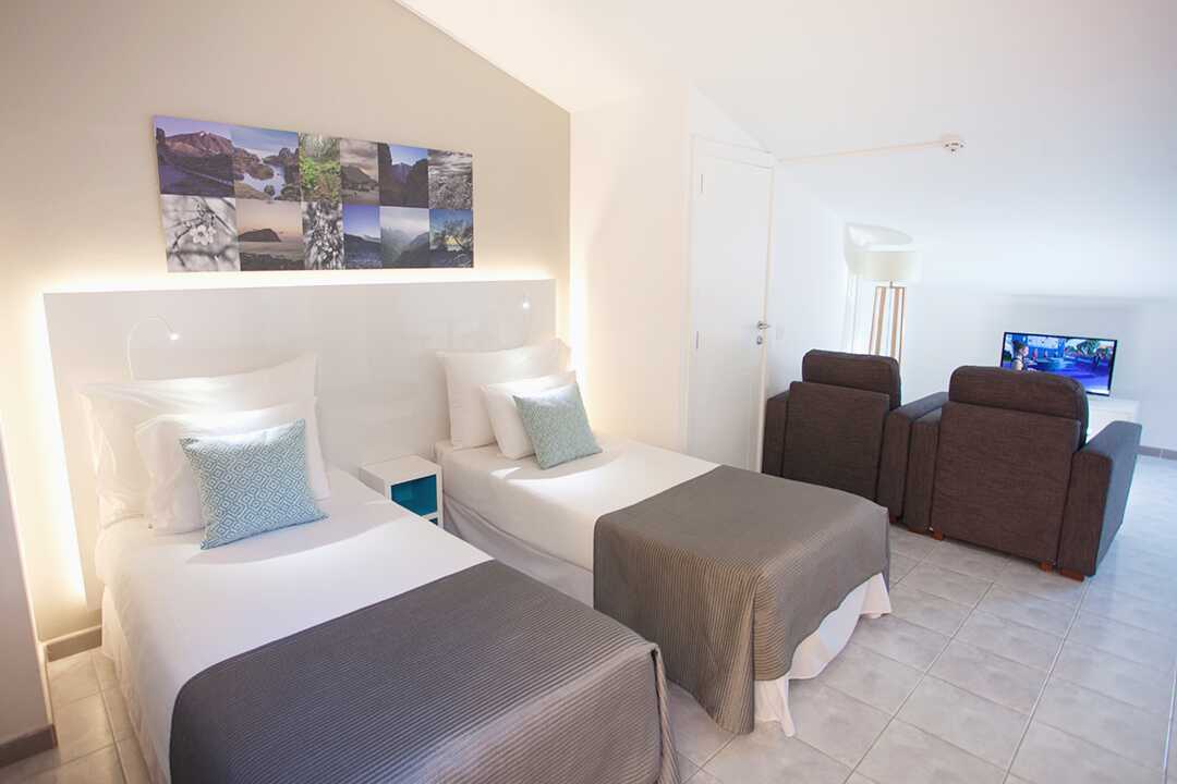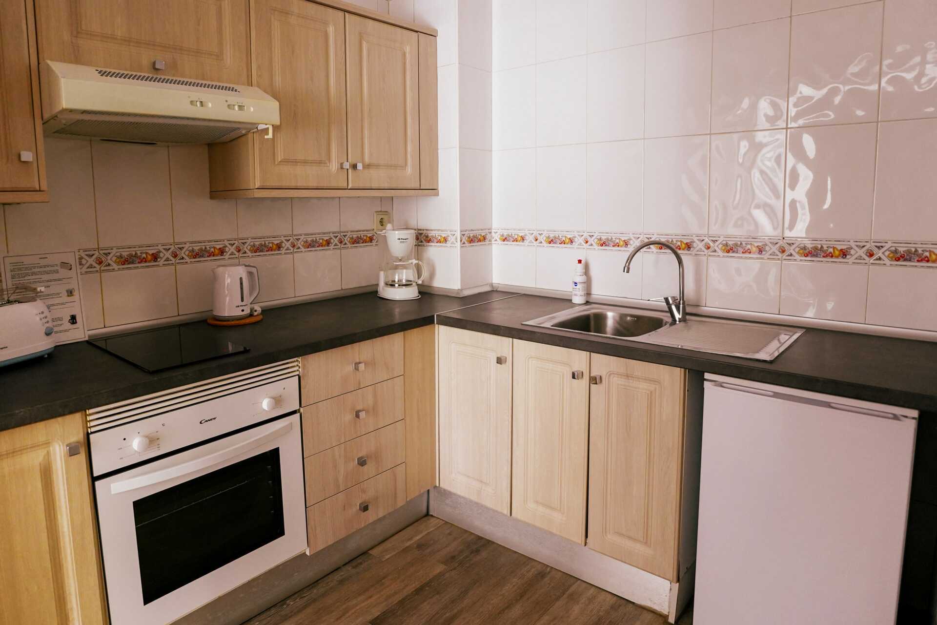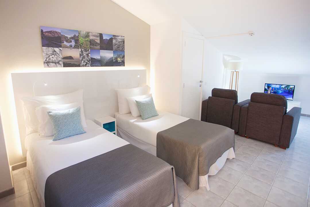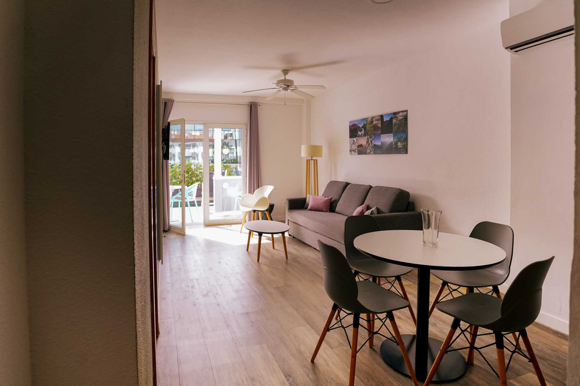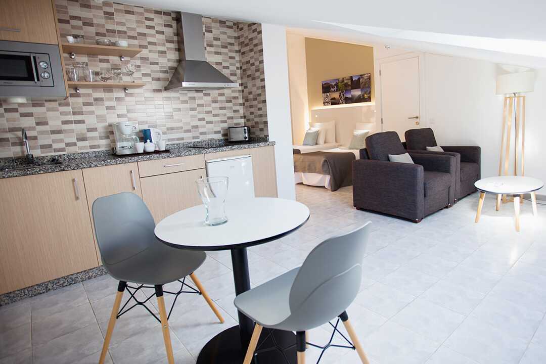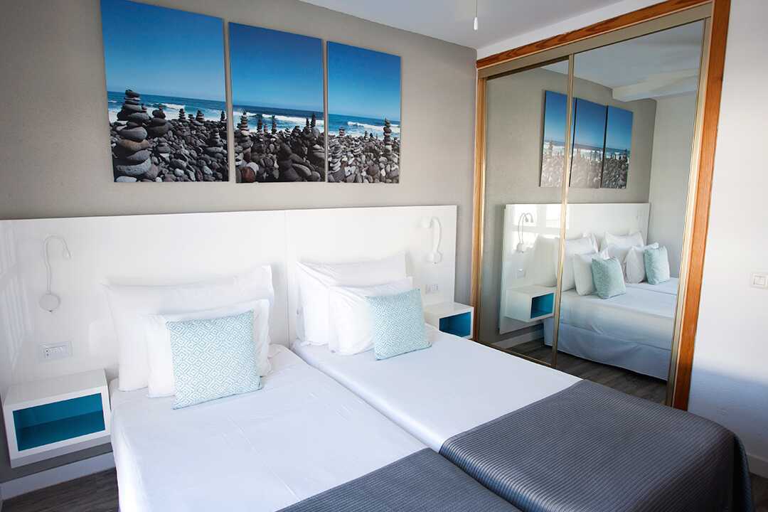 Driekamerappartement met balkon of terras. Twee slaapkamers en een gecombineerde woonkamer met keuken. Twee slaapkamers met twee éénpersoonsbedden in elke kamer. Er is de mogelijkheid om een extra bed toe te voegen op de slaapbank. Minikeuken met koelkast, oven, kookplaten, broodrooster, waterkoker, koffiezetapparaat en basiskeukengerei. Wifi en kluisje tegen betaling. Plafondventilator. Tv met internationale zenders. Föhn. Badkamer met bad en toilet. Schoonmaak 5 keer/week.