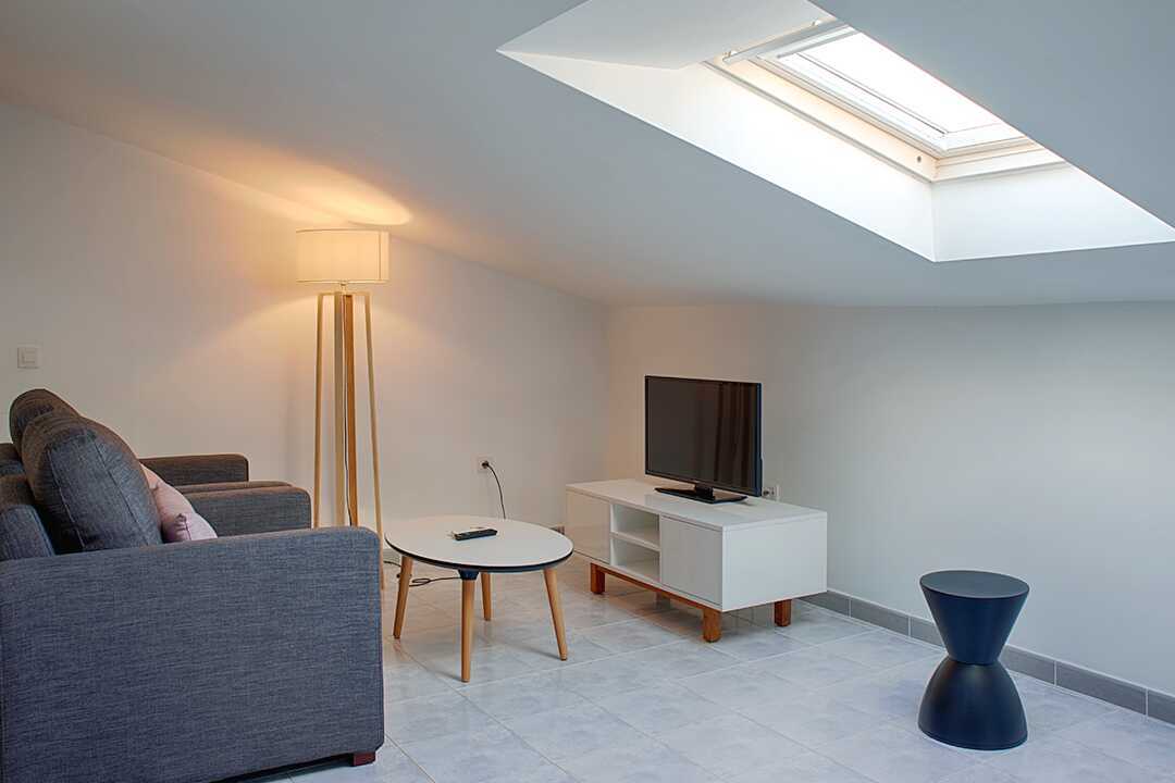 Studio zonder patio. De studio bevindt zich op de derde verdieping en heeft een raam in het dak. Op het dak zijn verschillende dakterrassen met ligstoelen. Gecombineerde slaapkamer en minikeuken. Twee eenpersoonsbedden. Minikeuken met koelkast, kookplaten, broodrooster, waterkoker, koffiezetapparaat en basis keukengerei. Wifi en kluis tegen betaling. Plafondventilator. Zithoek met twee fauteuils. TV met internationale zenders. Föhn. Badkamer met douche en toilet. Schoonmaak 5 keer/week.