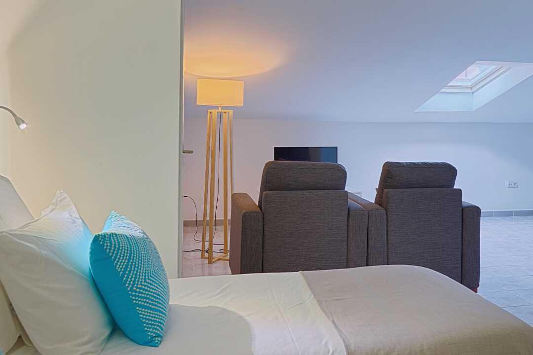 Tweekamerappartement met terras en privézwembad. Het privézwembad wordt verwarmd tot ongeveer 22 tot 25 graden, van november tot april - de zwembadtemperatuur kan 's ochtends, 's avonds en bij slecht weer echter een paar graden dalen. Ligstoelen en stoelen. Slaapkamer en gecombineerde woonkamer met minikeuken. Twee eenpersoonsbedden. Mogelijkheid voor extra bed in slaapbank. Minikeuken met koelkast, kookplaat, oven, broodrooster, waterkoker, koffiezetapparaat en basis keukengerei. Wifi en kluis tegen betaling. Plafond ventilator. TV met internationale zenders. Föhn. Badkamer met bad en toilet. Schoonmaak 5 keer/week. De minimumleeftijd om in dit appartement te verblijven is 16 jaar.