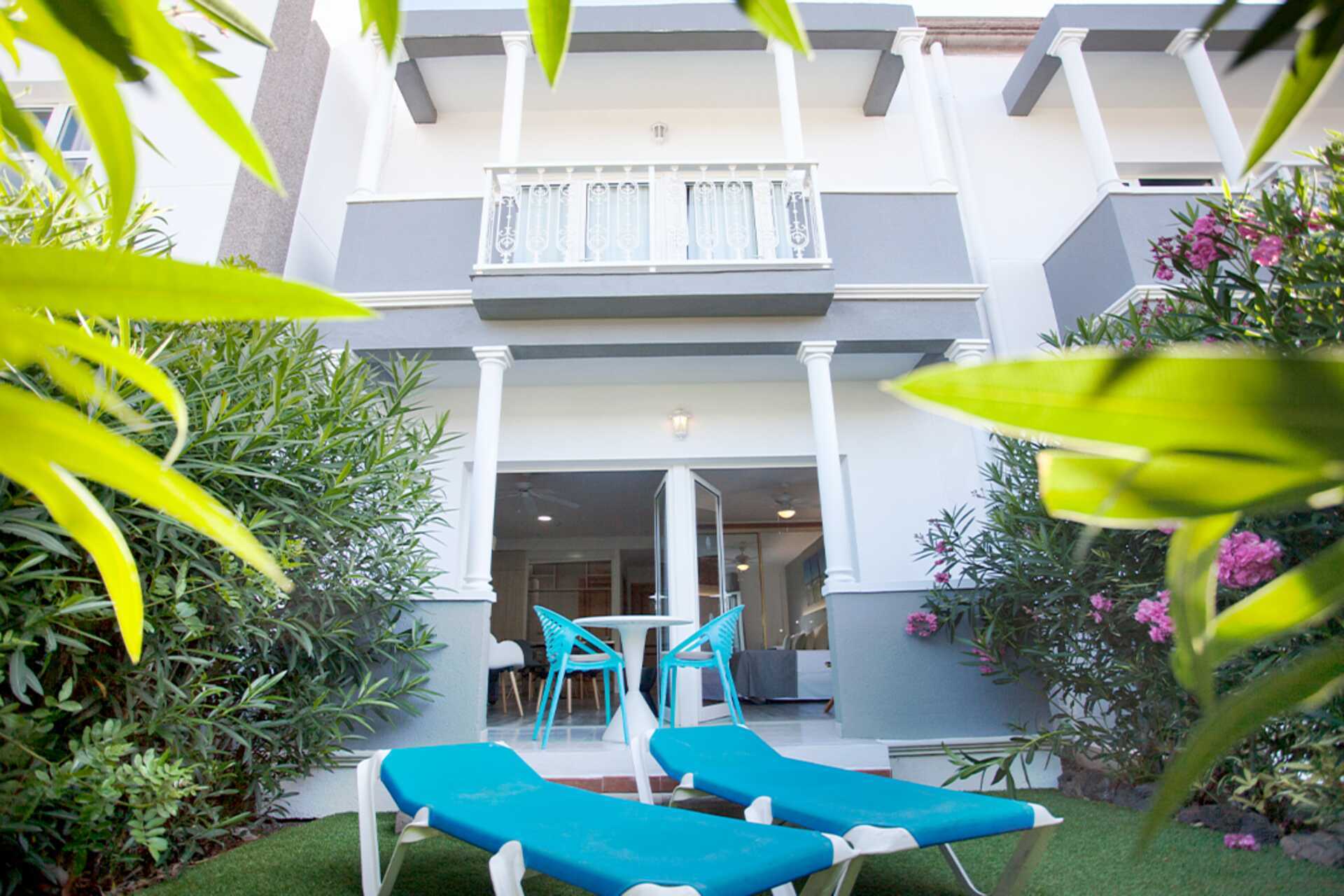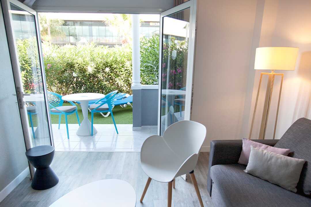 Tweekamerappartement met een verhoogd grond terras en een privé tuin met ligstoelen en zitjes. Sommige appartementen hebben uitzicht op het zwembad of op de golfbaan. Slaapkamer en gecombineerde keuken/woonkamer. Twee éénpersoonsbedden. Er is de mogelijkheid om een extra bed toe te voegen op de slaapbank. Minikeuken met koelkast, kookplaten, broodrooster, waterkoker, koffiezetapparaat en basiskeukengerei. Wifi en kluisje tegen betaling. Plafondventilator. TV met internationale zenders. Föhn. Badkamer met bad en toilet. Schoonmaak 5 keer/week.