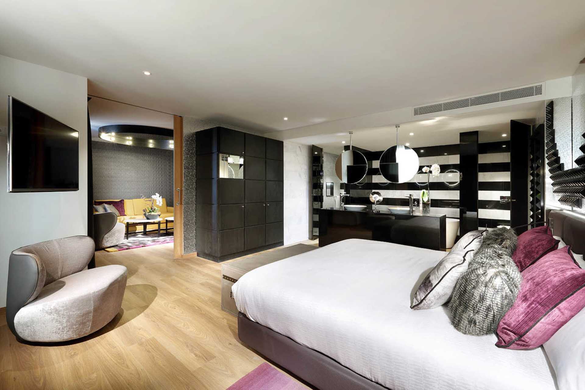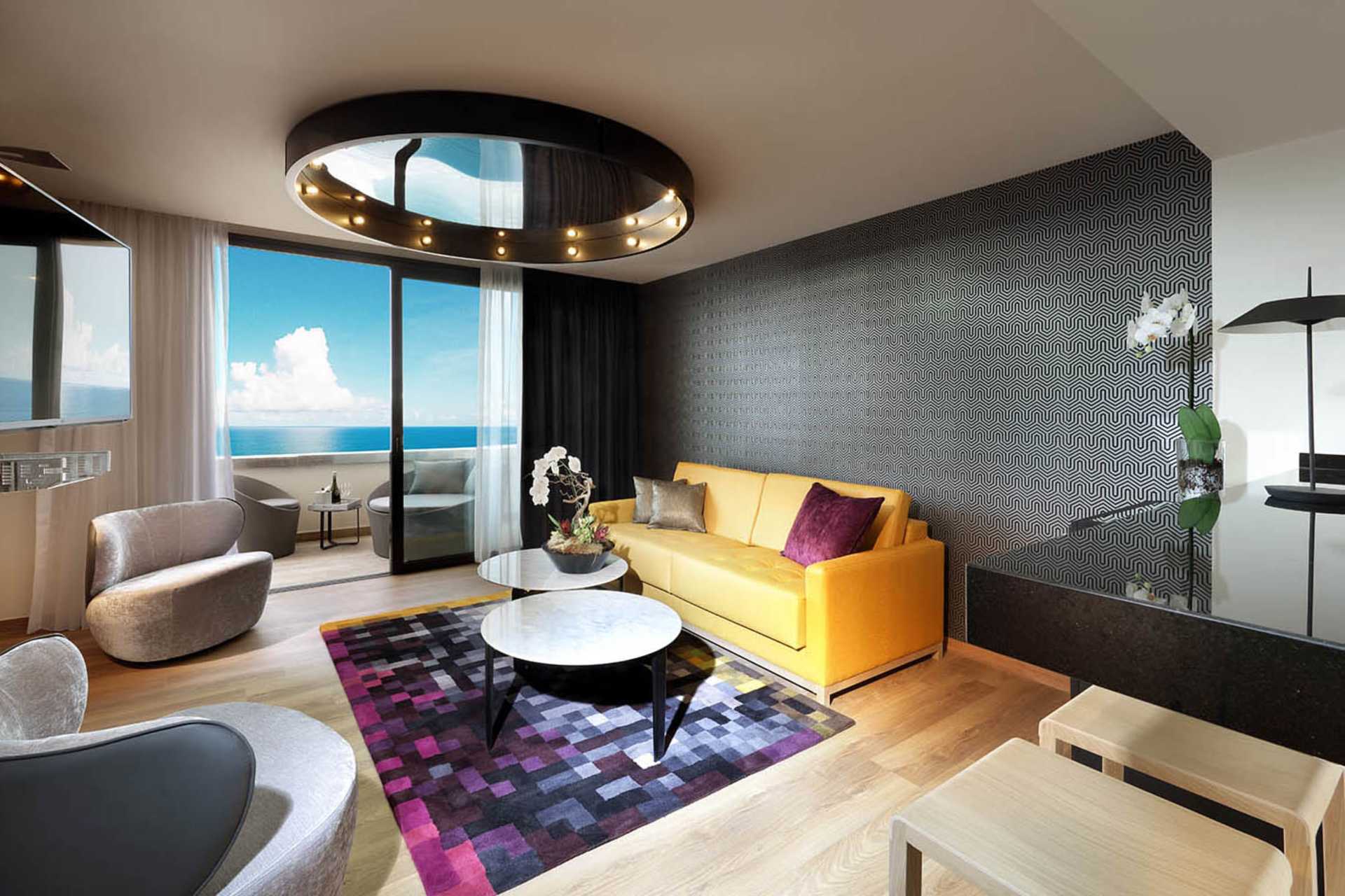 Suite met balkon of terras en uitzicht op zee. De suite bestaat uit een slaapkamer en een woonkamer. Een tweepersoonsbed of twee eenpersoonsbedden waar je heerlijk slaapt tussen de Sleep-Like-A-Rock ® lakens. Mogelijkheid voor extra bedden in slaapbank. Wifi, airconditioning en kluisje inbegrepen. Wijnkoeler. Minibar tegen betaling. Nespresso-apparaat - capsules inbegrepen en elke dag bijgevuld. Tv met internationale zenders. Spelconsole. Badjassen. Föhn. Rock Spa ® producten. Een badkamer met douche en whirlpool en een kleinere badkamer met toilet. Schoonmaak 7 keer/week.