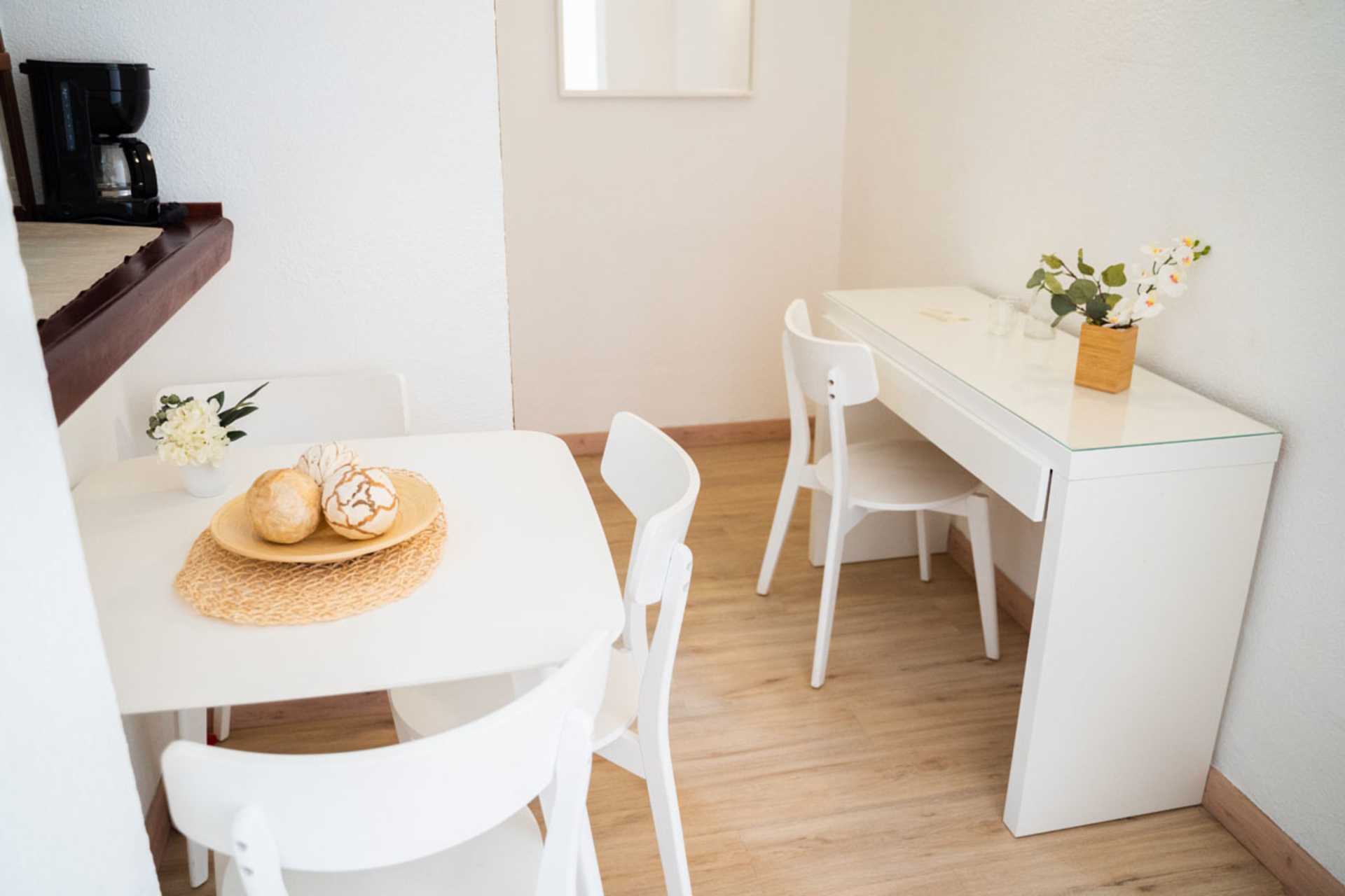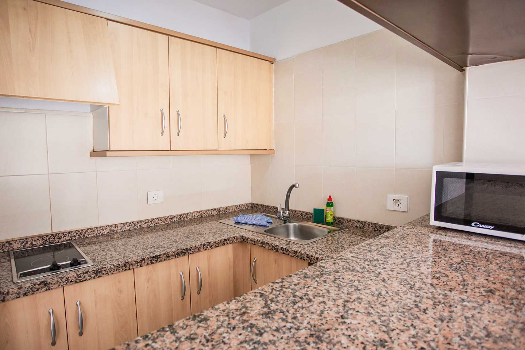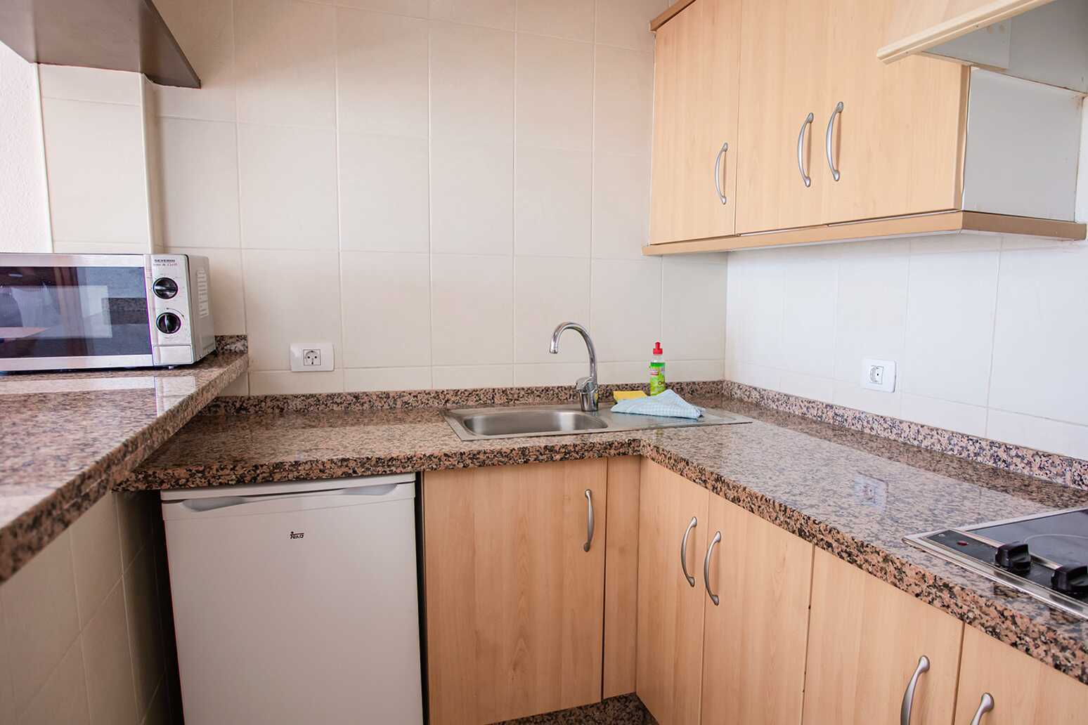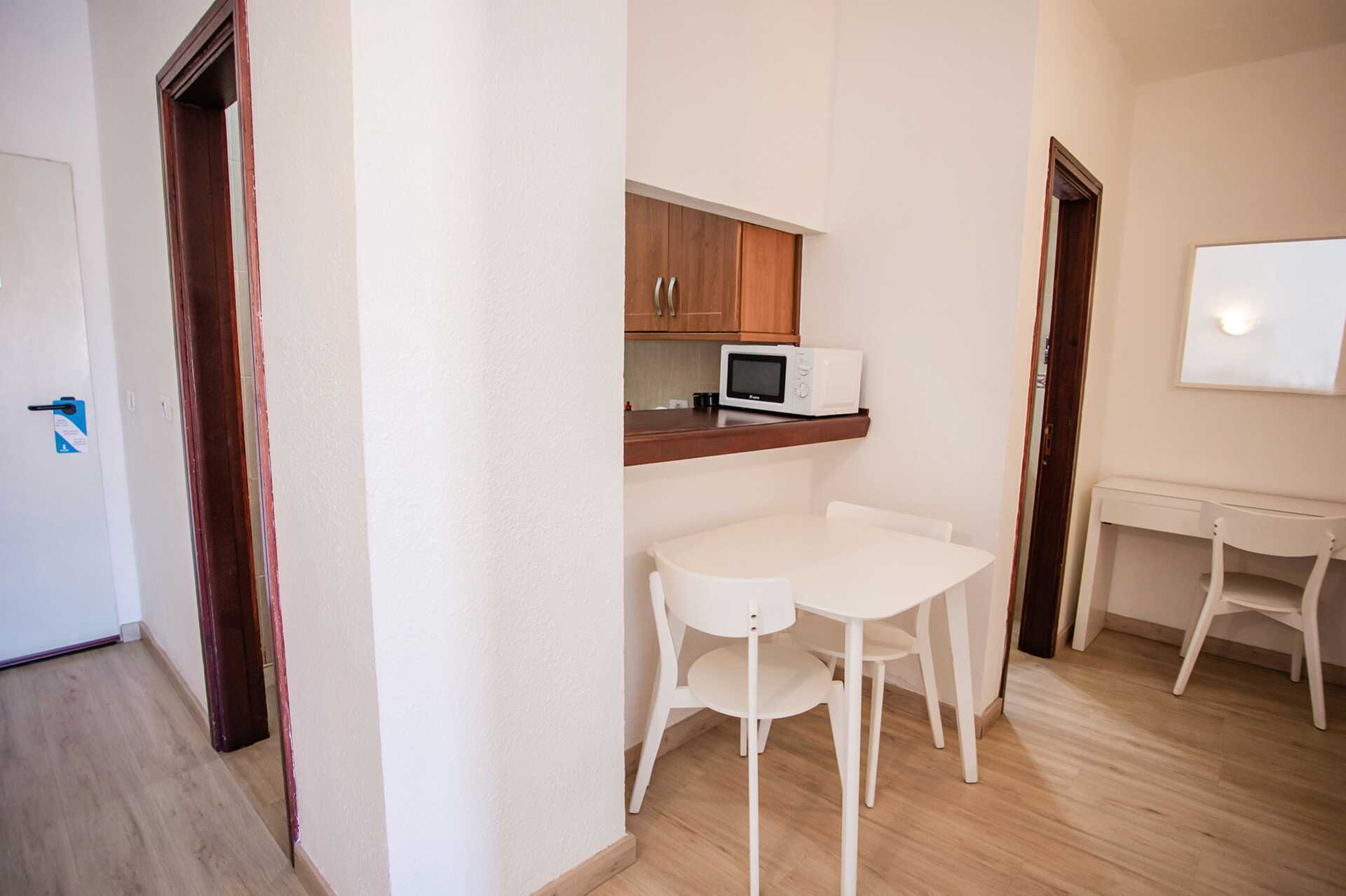 Eenkamerappartement met terras op de begane grond en uitzicht op het zwembad. Gecombineerde slaapkamer en woonkamer met kitchenette. Twee eenpersoonsbedden. Mogelijkheid voor een extra bed op de slaapbank. Minikeuken met kookplaten, koelkast, waterkoker, koffiezetapparaat en basis keukengerei. Wifi inbegrepen. Kluis tegen betaling. TV met internationale zenders. Badkamer met douche en toilet. Schoonmaak 5 keer/week.