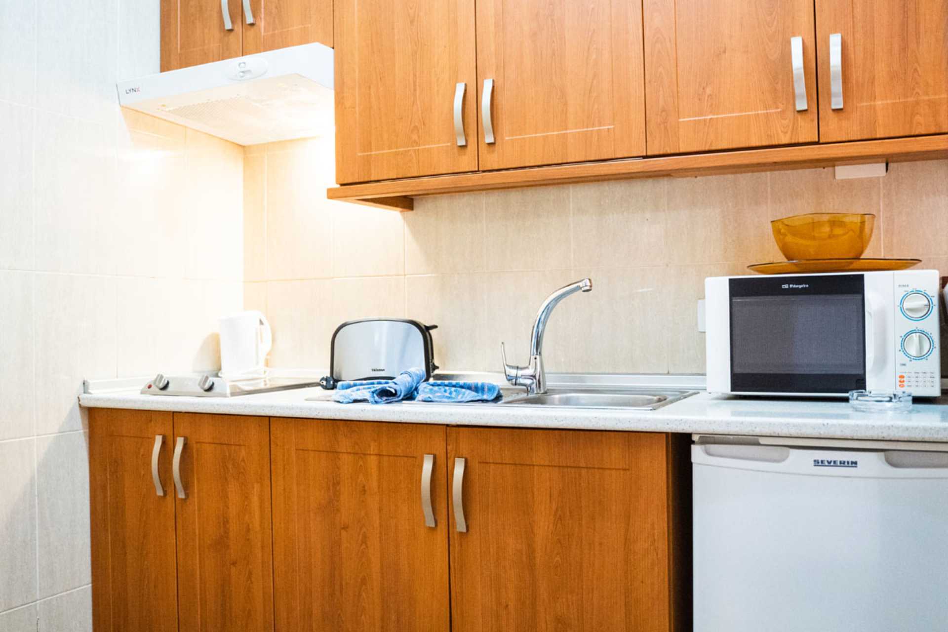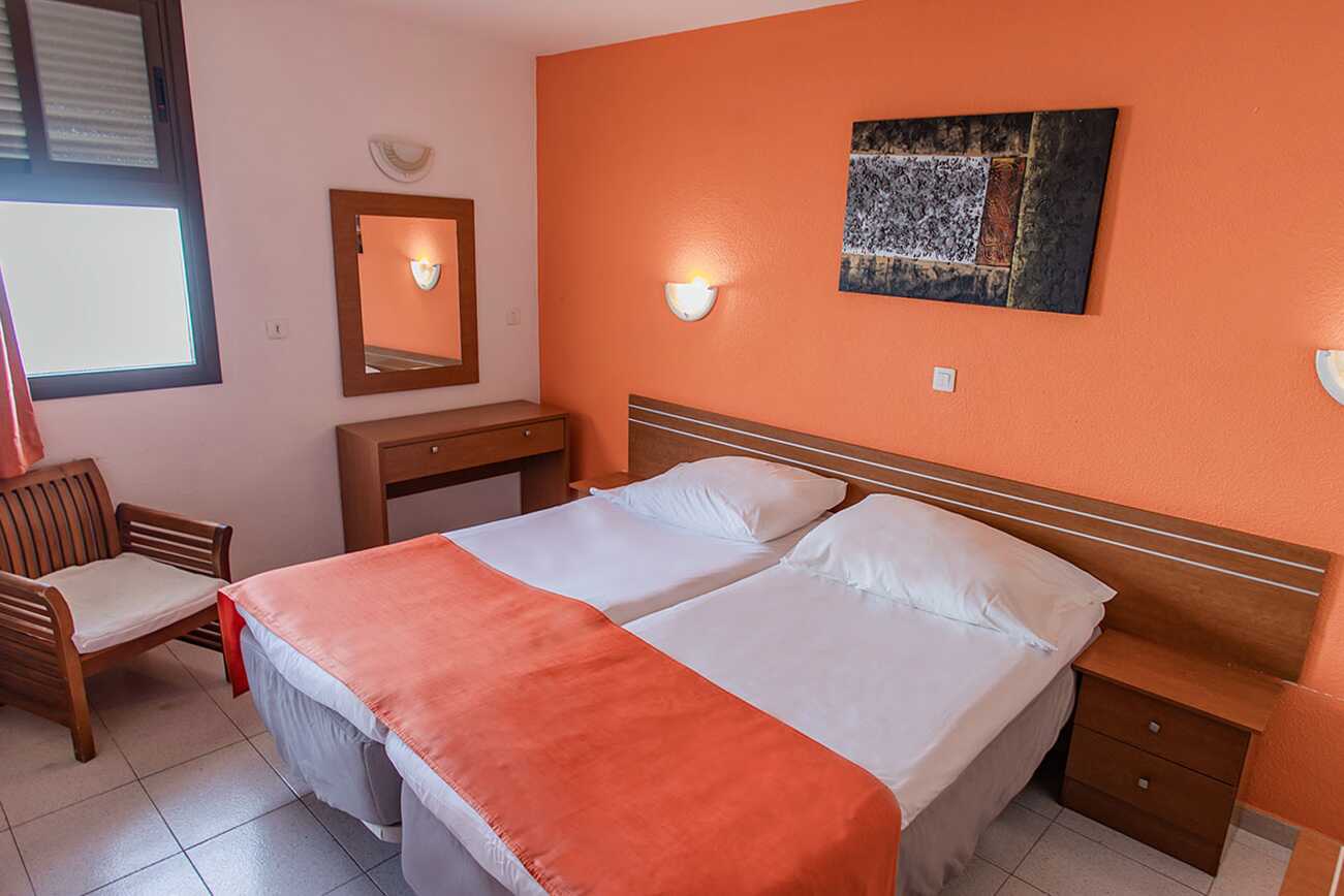 Tweekamerappartement met balkon, deels met zeezicht of beperkt zeezicht. Slaapkamer en gecombineerde woonkamer met kitchenette. Twee eenpersoonsbedden. Mogelijkheid voor een extra bed op de slaapbank. Minikeuken met kookplaten, koelkast, waterkoker, koffiezetapparaat en basis keukengerei. Wifi inbegrepen. Kluis tegen betaling. TV met internationale zenders. Badkamer met douche en toilet. Schoonmaak 5 keer/week.
