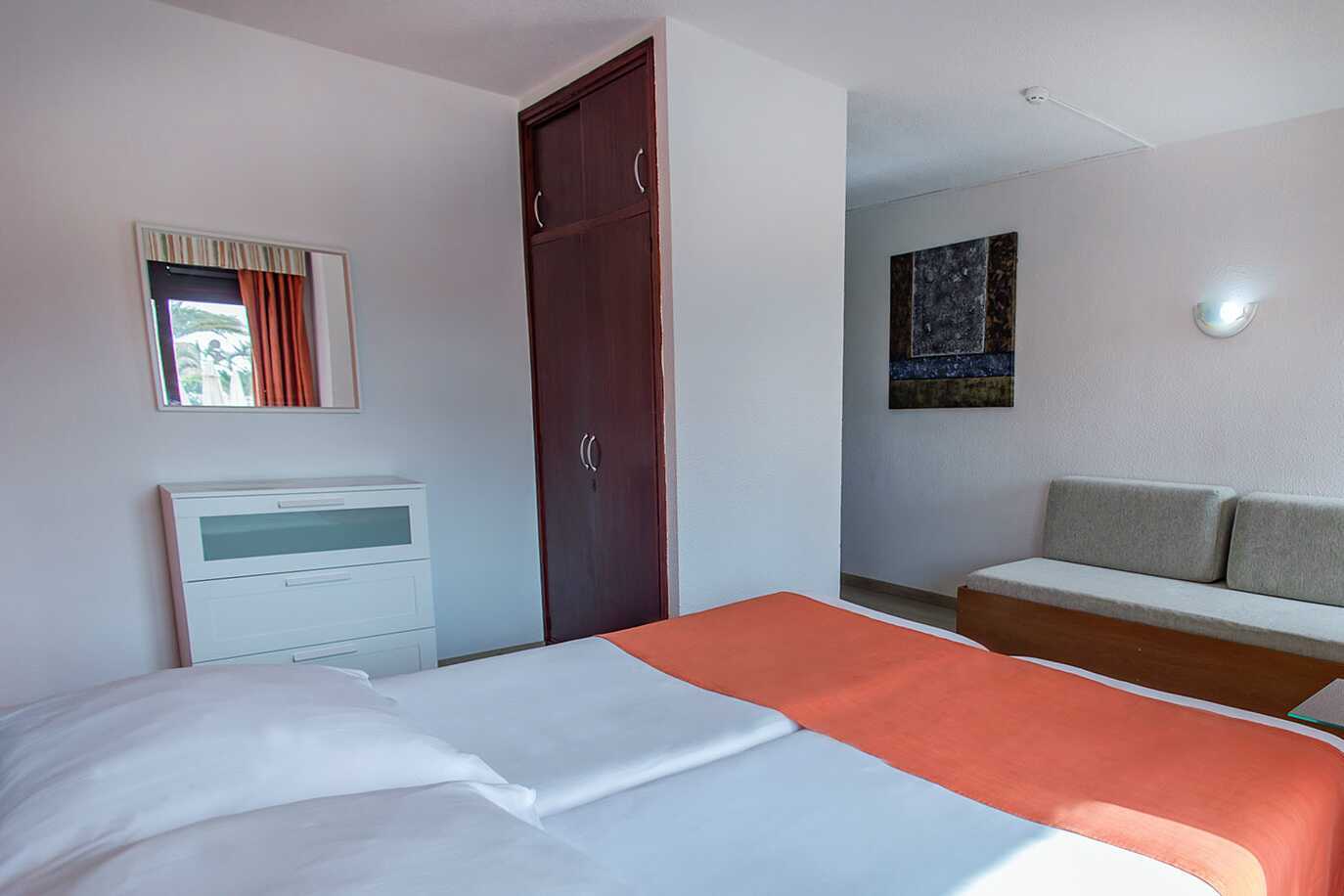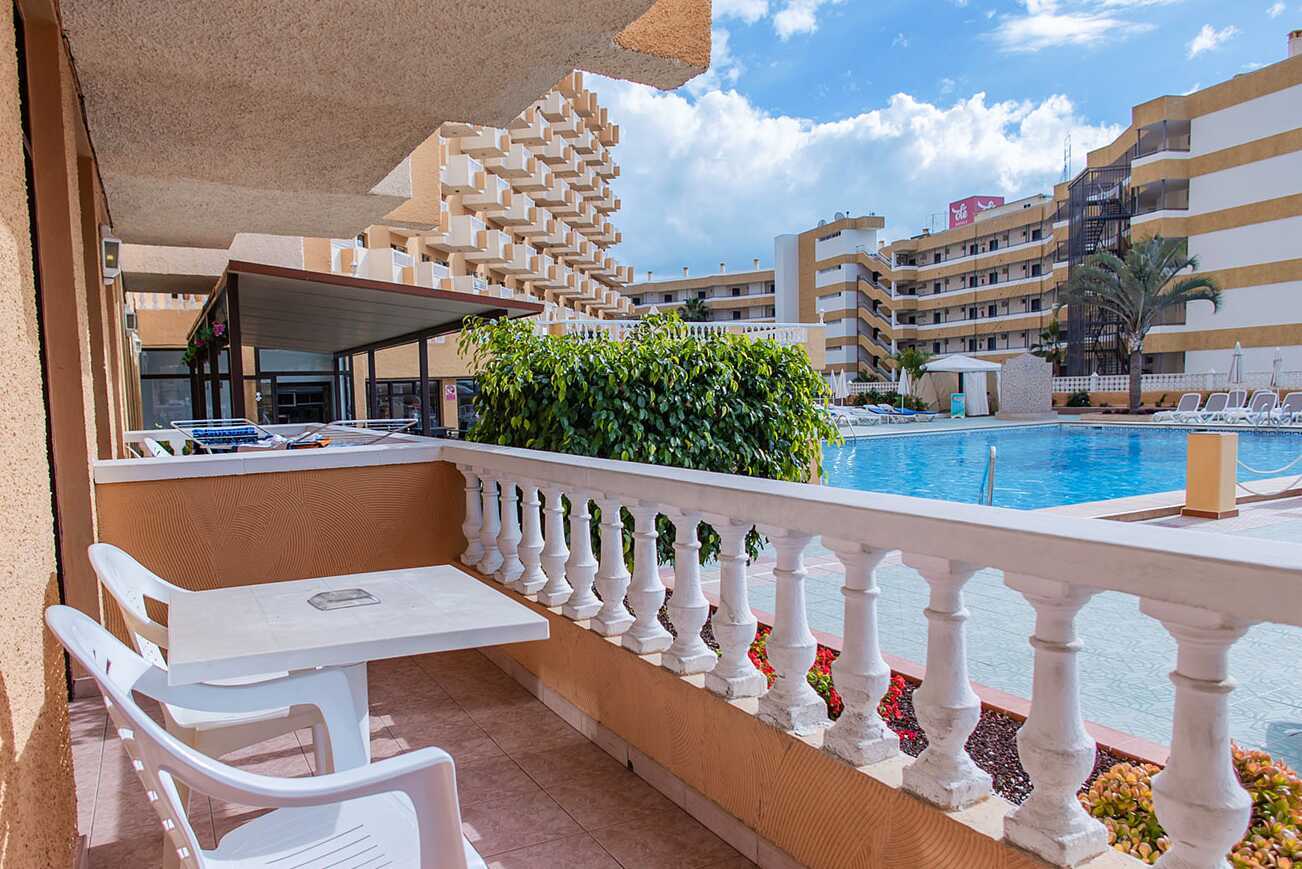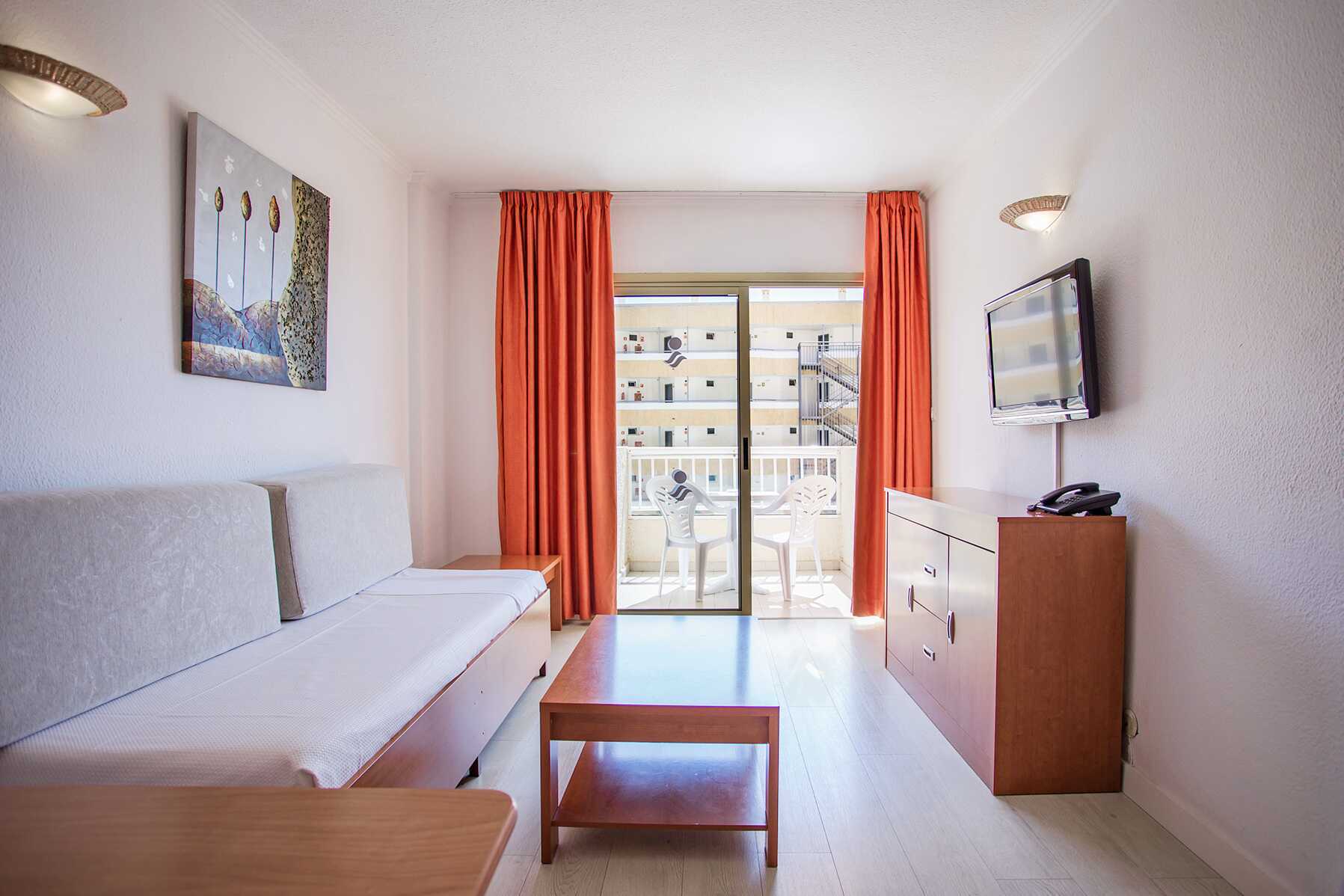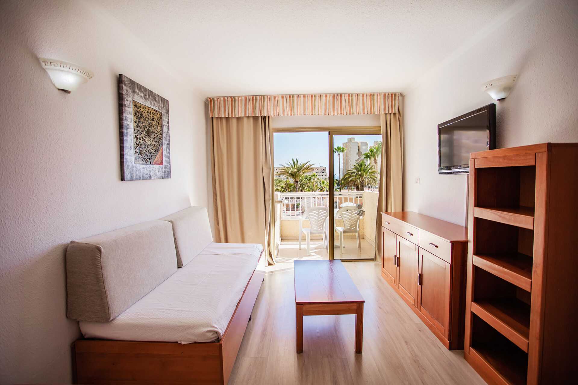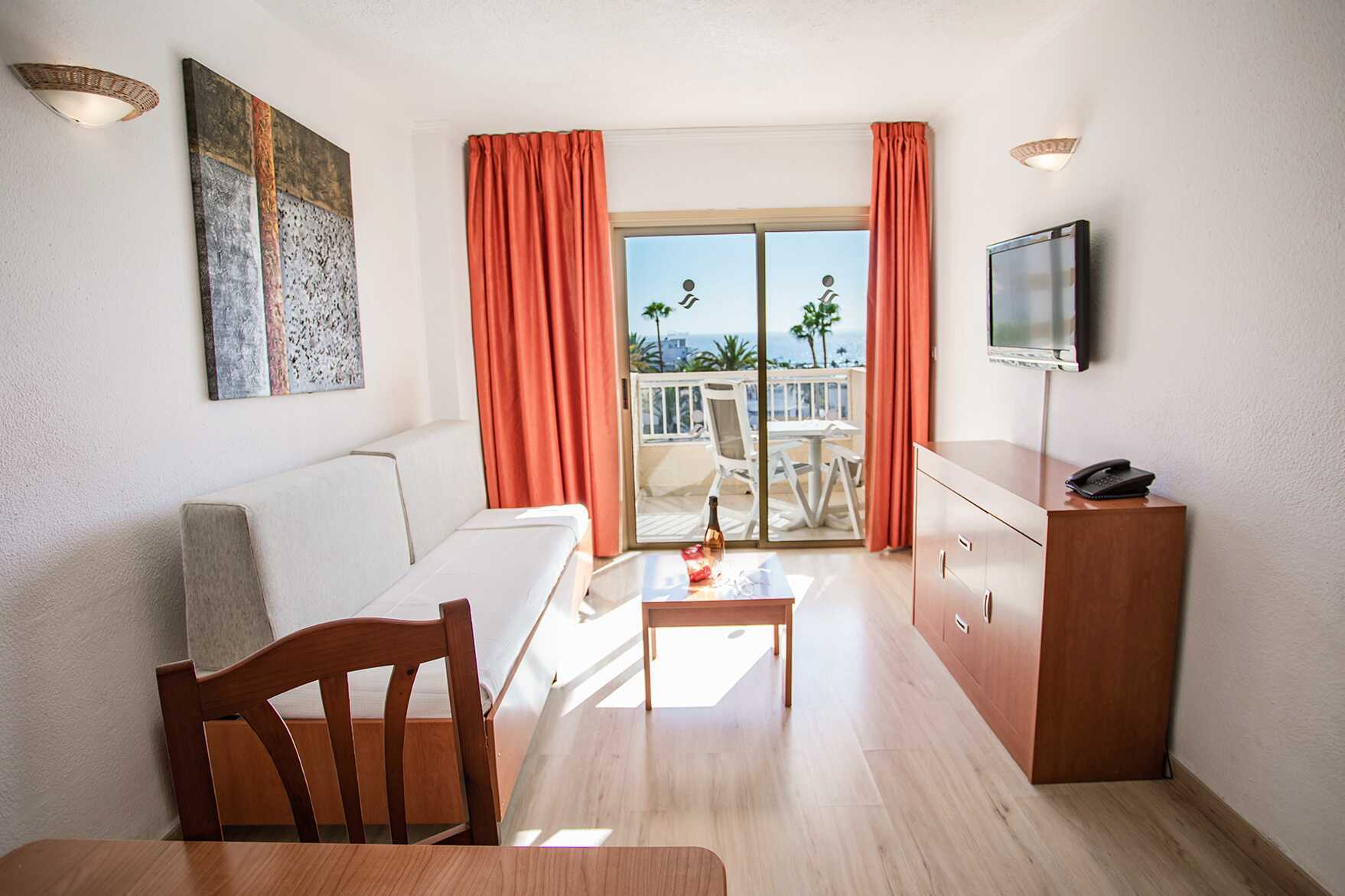 Deluxe tweekamerappartement met balkon met uitzicht op het zwembad en of met beperkt zeezicht. Cava, noten en gedroogd fruit op de kamer bij aankomst. Slaapkamer en gecombineerde woonkamer met kitchenette. Twee eenpersoonsbedden. Mogelijkheid voor een extra bed op de slaapbank. Minikeuken met kookplaten, koelkast, waterkoker, koffiezetapparaat en basis keukengerei. Wifi inbegrepen. Kluis tegen betaling. TV met internationale zenders. Föhn. Badkamer met douche en toilet. Schoonmaak 5 keer/week.