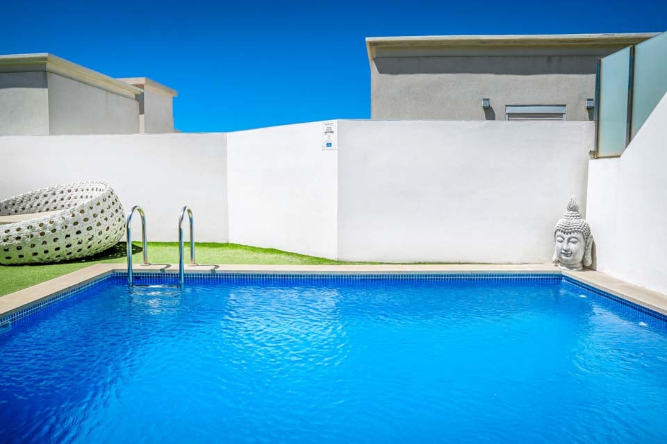 Vanuit de woonkamer leiden openslaande deuren naar uw buitenruimte met een privézwembad dat elektrisch verwarmd is* en ligstoelen met comfortabele matrassen. Een open terras met eettafel bevindt zich vlakbij een barbecue, ideaal voor ontspannen dagen waarop u met familie en vrienden buiten kunt dineren.