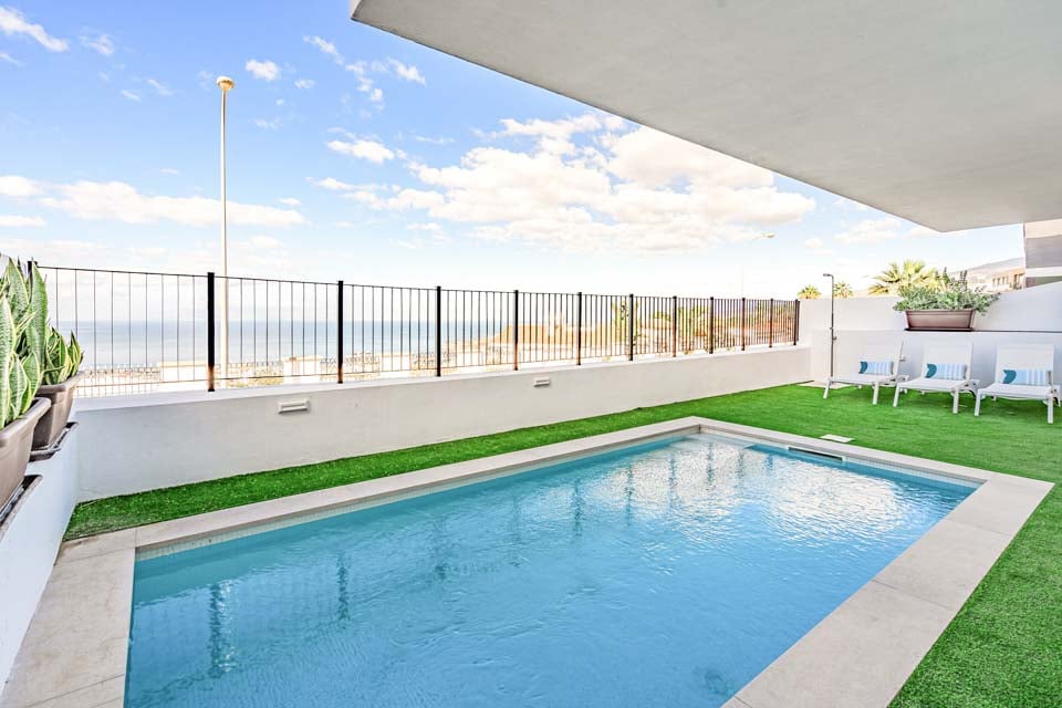 Villa Tagora Breeze is een prachtige, witgekalkte villa met uitzicht op zee, gelegen in de zeer gewilde badplaats Costa Adeje. We konden maar geen genoeg krijgen van het panoramische uitzicht op zee, dat vanaf de hele voorgevel van de villa te zien was. Geniet van het uitzicht op de golven die in de verte kabbelen vanaf het terras bij het zwembad, het eetgedeelte op de begane grond of het terras van de hoofdslaapkamer op de bovenste verdieping. Hoewel deze villa geen verwarmd zwembad heeft, beschikt ze wel over een zwembad omgeven door kunstgras, comfortabele ligstoelen en een prachtig uitzicht over de Atlantische Oceaan.