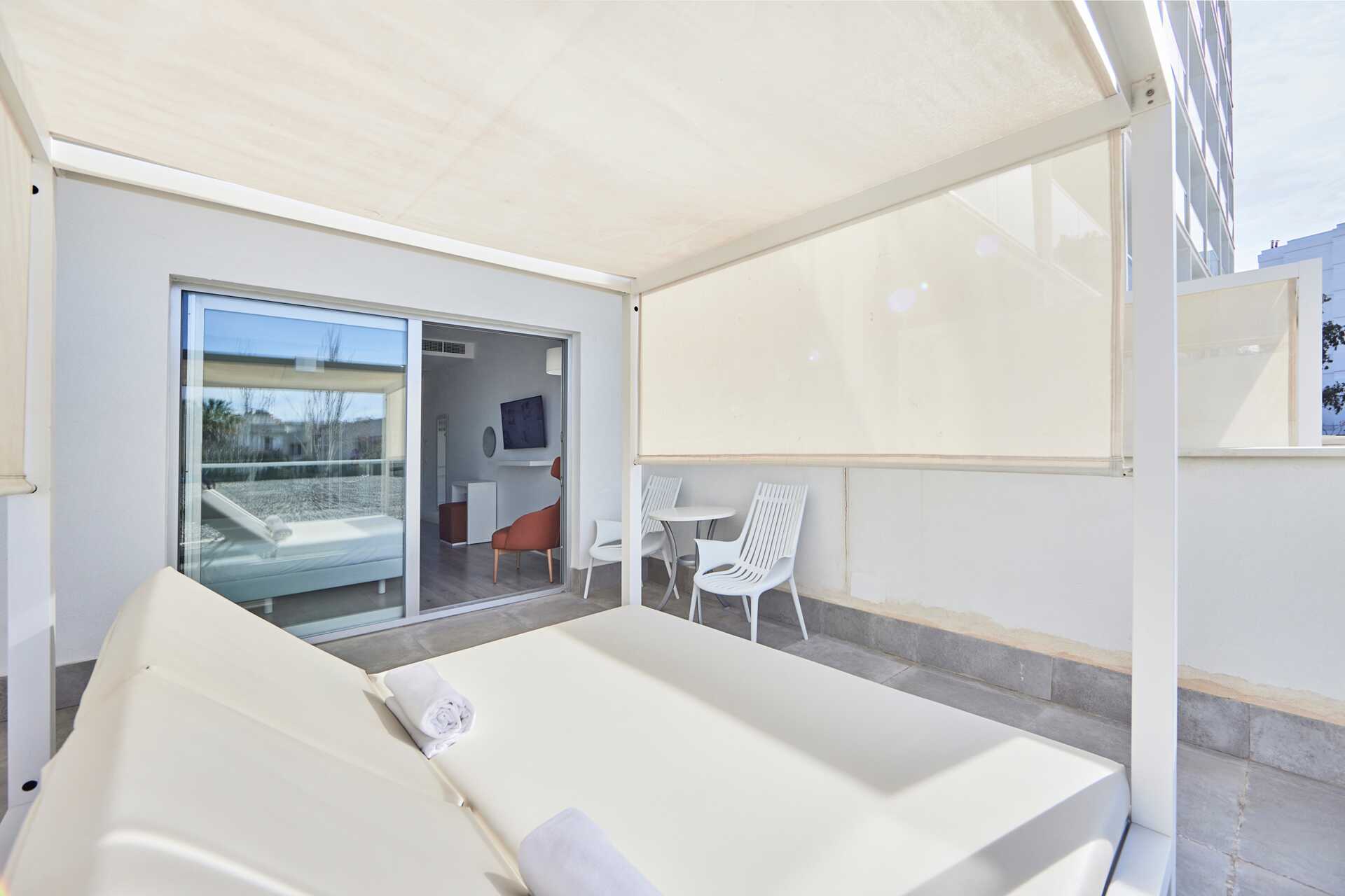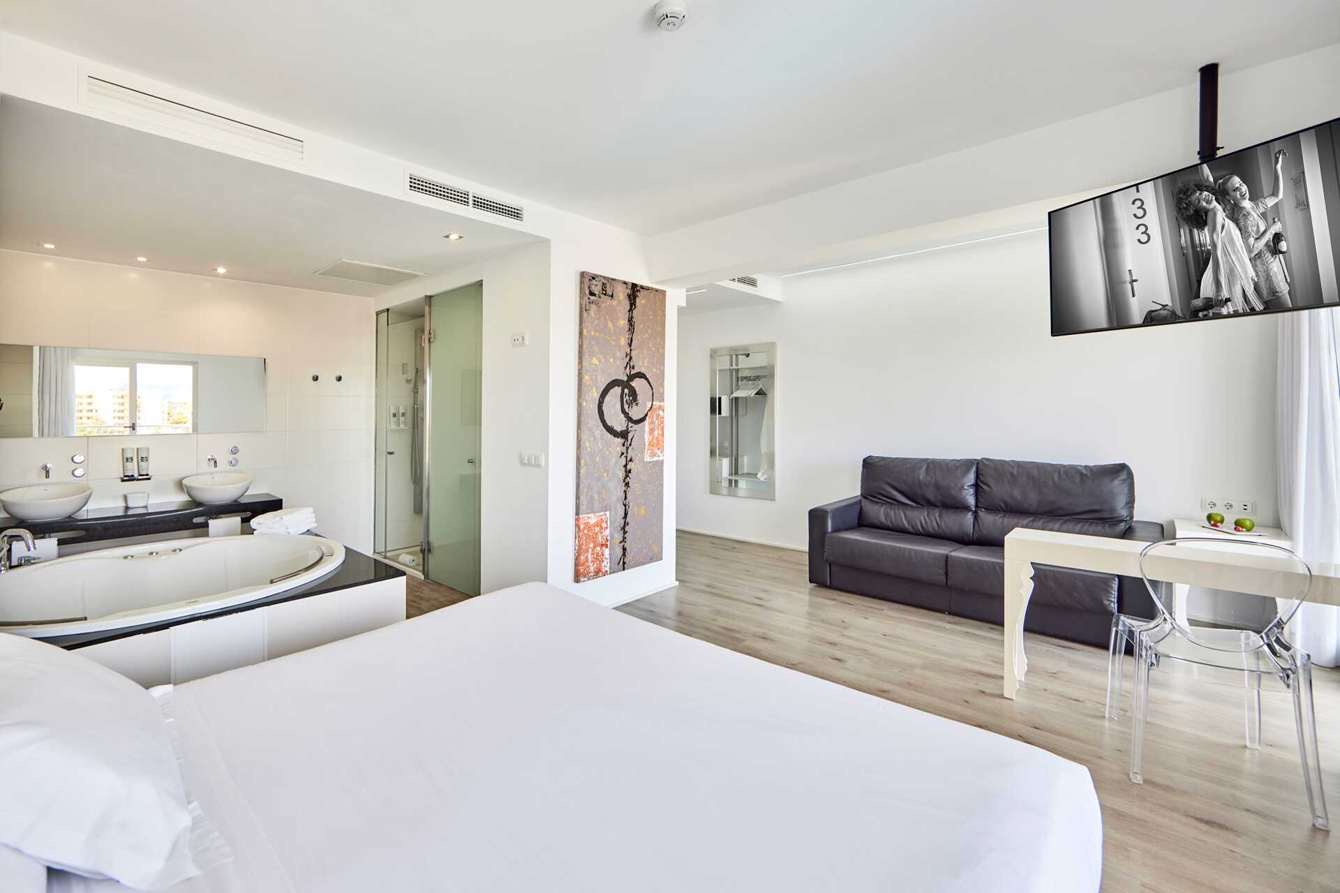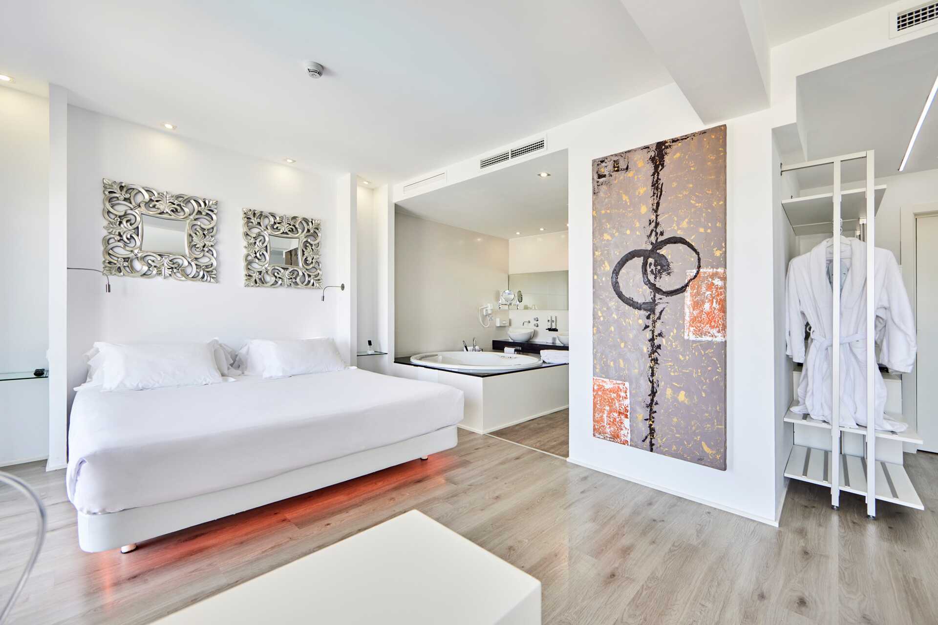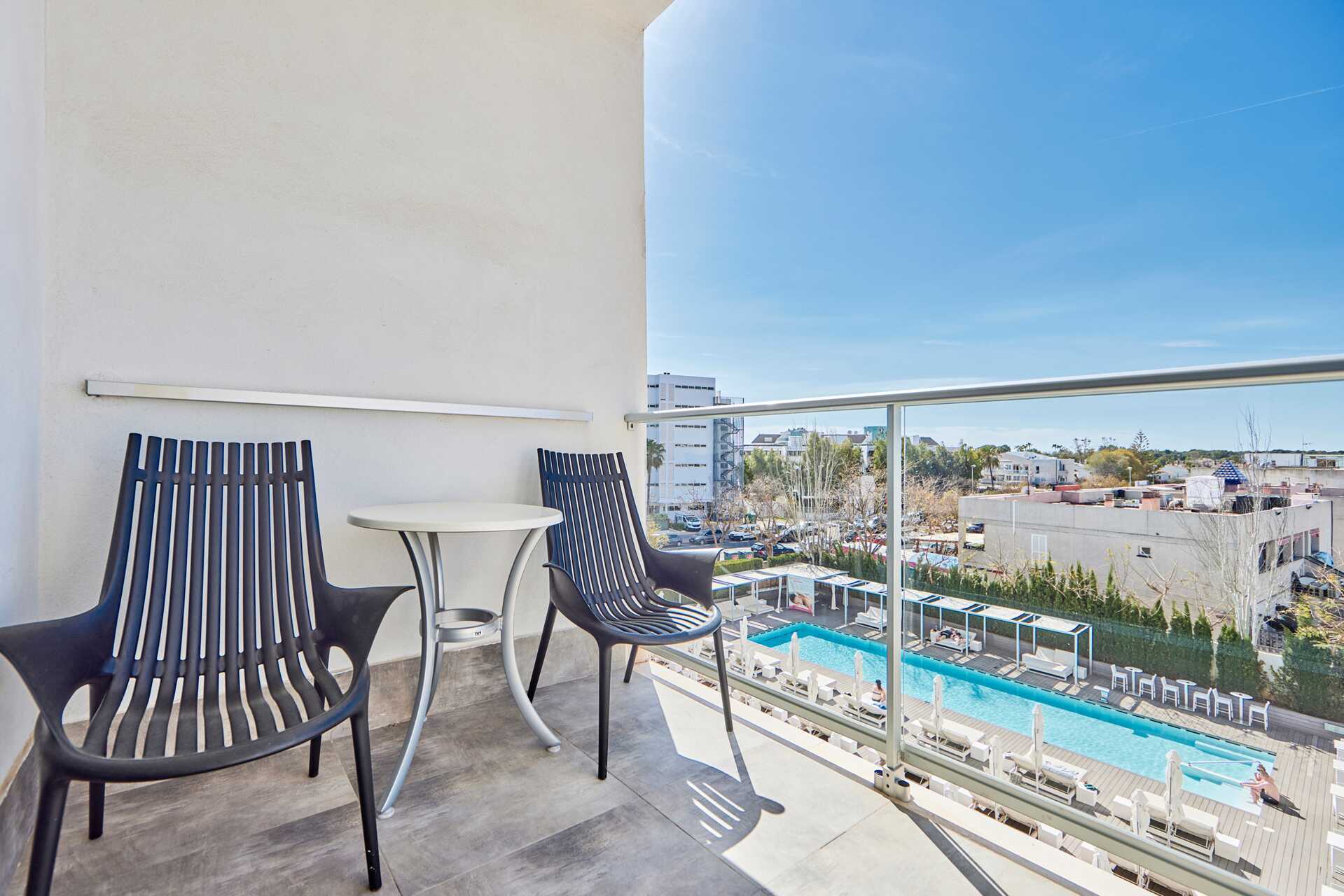 Deluxe Junior Suite met balkon en uitzicht op het zwembad. Suites bevinden zich op verdiepingen 1-6. Een tweepersoonsbed. Wifi, airconditioning en kluisje inbegrepen. Koelkast. Waterkoker. Nespresso-apparaat - capsules inbegrepen bij aankomst. Tv met internationale zenders. Badjassen en hotelslippers. Open badkamer met föhn, jacuzzi, aparte douche en toilet. Schoonmaak 7 keer / week.