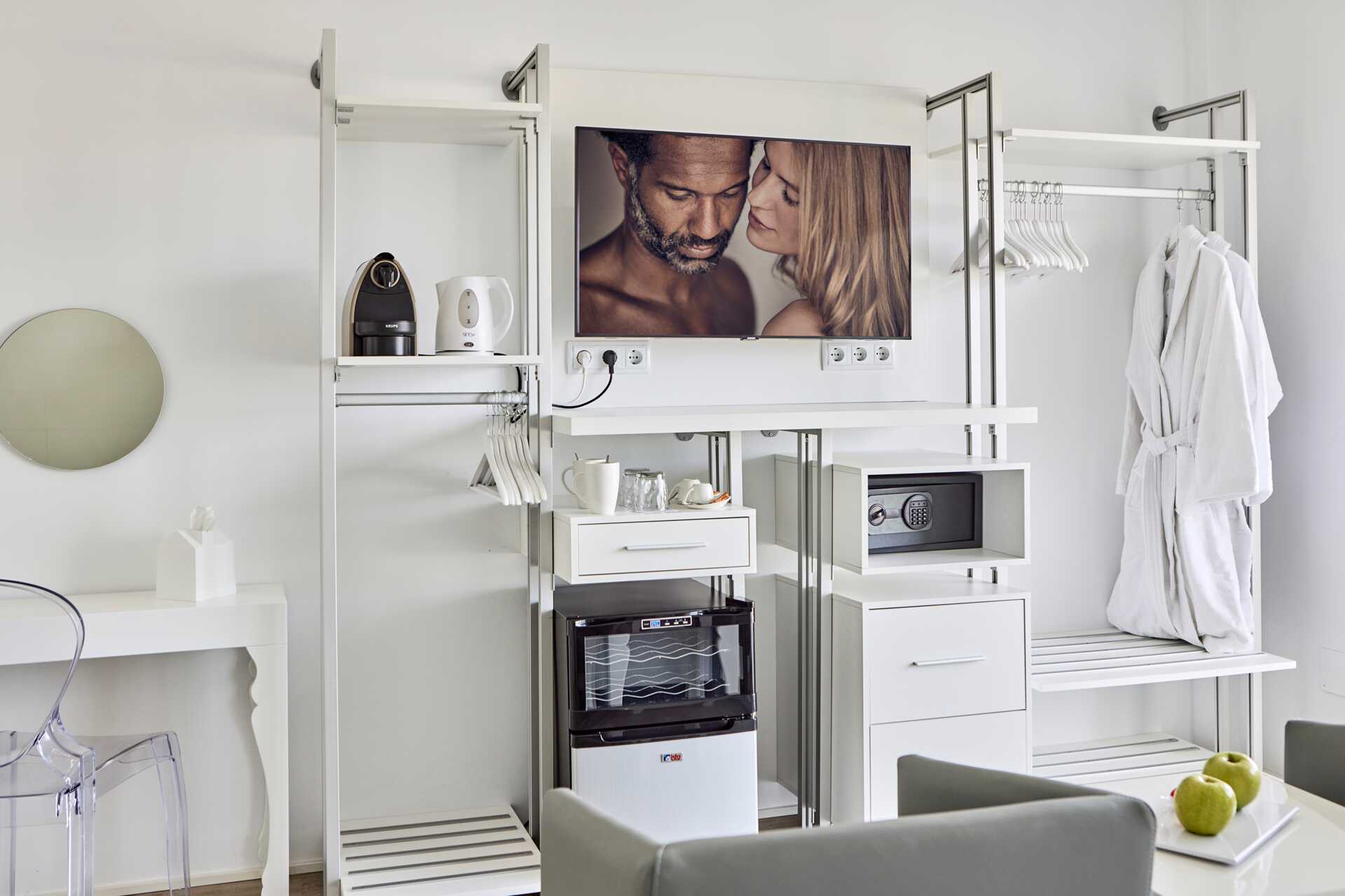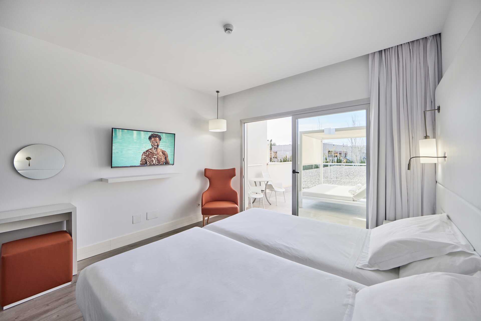 Deluxe kamer met balkon en zwembadzicht of met groot balkon of terras met zwembadzicht. De kamers met balkon bevinden zich op verdiepingen 5-6. De kamers met groot balkon of terras bevinden zich op verdieping 1 en de patio is voorzien van stoelen en tafels en een groot comfortabel balinese bed. Een tweepersoonsbed. Wifi, airconditioning en kluisje inbegrepen. Koelkast. Elektrische waterkoker. Nespresso-apparaat - capsules inbegrepen bij aankomst. Tv met internationale zenders. Badjassen en hotelslippers. Föhn. Badkamer met douche en toilet. Schoonmaak 7 keer/week.