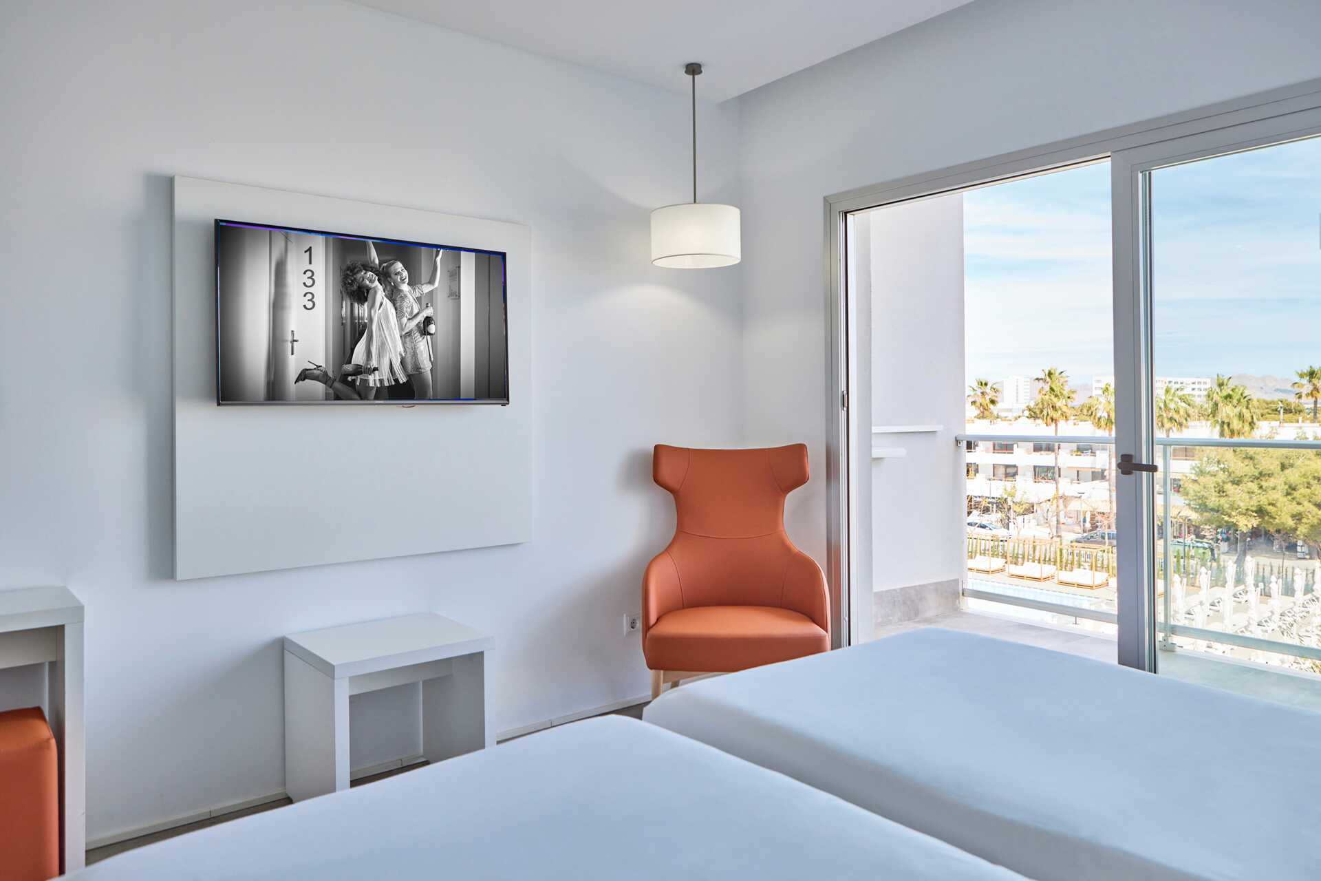 Tweepersoonskamers met een balkon, sommige met uitzicht op het zwembad of met een groot balkon of terras. Kamers met een balkon bevinden zich op verdiepingen 2 tot 4. Kamers met een groot balkon of terras bevinden zich op verdieping 1 en de patio heeft een tafel en stoelen en een comfortabel balinese bed. Twee eenpersoonsbedden. Wifi, airconditioning en kluisje inbegrepen. Koelkast. Waterkoker. Tv met internationale zenders. Föhn. Badkamer met douche en toilet. Schoonmaak 7 keer/week.