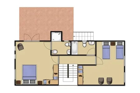 Er is een tweede slaapkamer met tweepersoonsbed, die prachtig is afgewerkt, en tot slot een mooie, ruime kamer met twee eenpersoonsbedden. Alle kamers zijn voorzien van zeer welkome airconditioning.