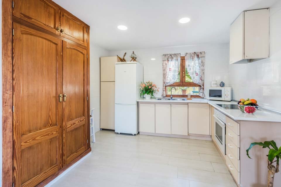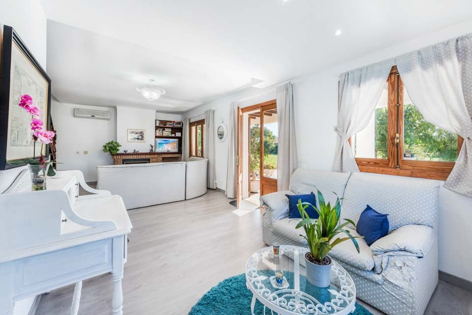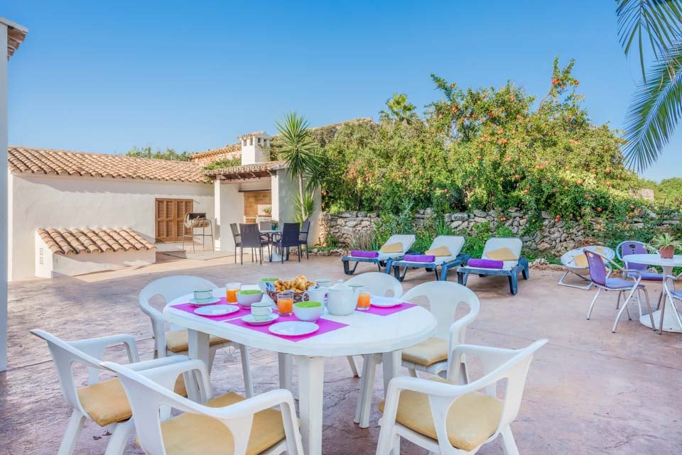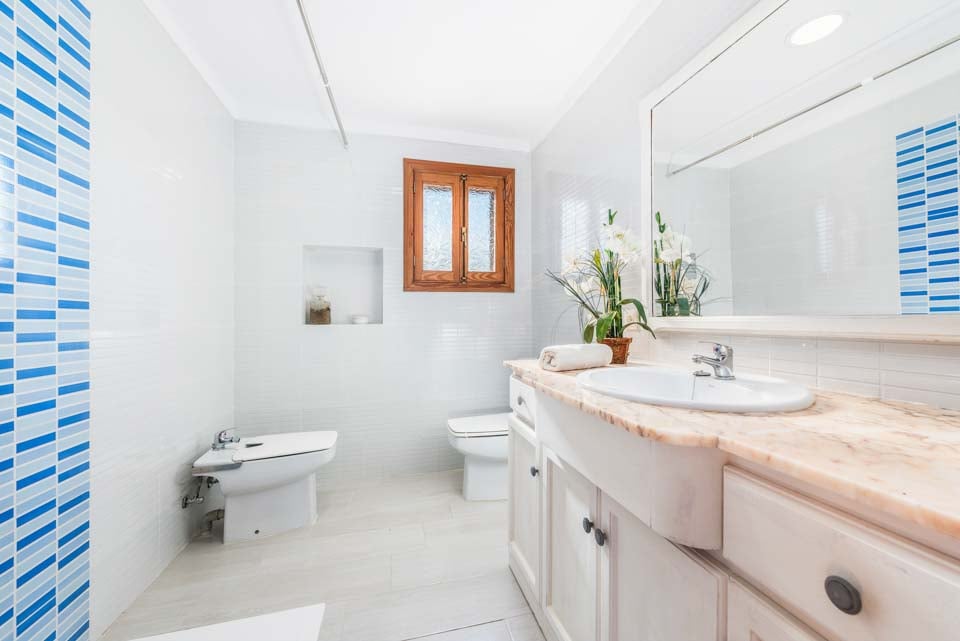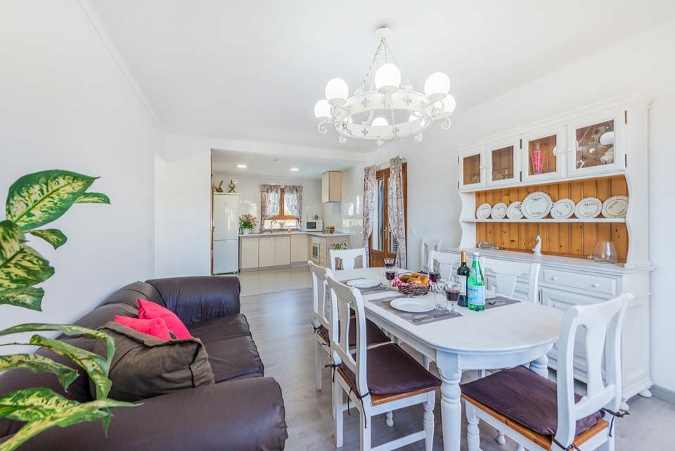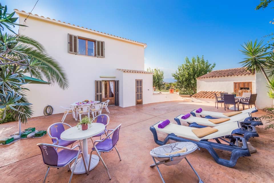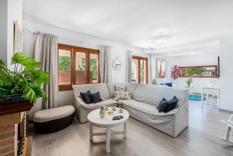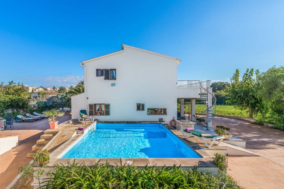 De villa is gebouwd in een klassieke Spaanse stijl, met een glanzend witte buitenkant. Rondom het pand ligt een stenen terras met zitgedeeltes waar u buiten kunt eten en zonnebaden. Er zijn twee eettafels buiten en ligstoelen waar u heerlijk van de zon kunt genieten. Het zwembad in het midden van het terras is prachtig. Koel af van de middagzon en geniet van een duik in het prachtige landschap. Wij waren erg gecharmeerd van de extra smeedijzeren wenteltrap buiten, die naar een terras op de bovenverdieping leidt. Dit is dé plek voor cocktails, met een panoramisch uitzicht over het landschap van Mallorca.