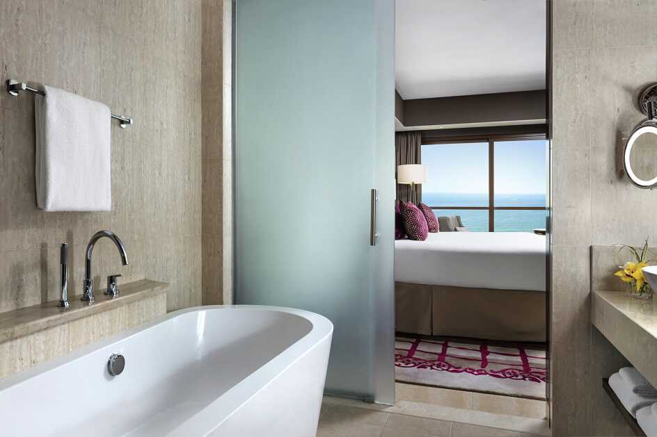 Deluxe kamer met balkon en uitzicht op zee. De kamers bevinden zich op de verdiepingen 5 tot en met 14. Een tweepersoonsbed of twee eenpersoonsbedden. Mogelijkheid voor een extra bed in een eenpersoonsbed. Wifi, airconditioning en kluisje inbegrepen. Minibar. Nespresso-apparaat. Waterkoker en koffie en thee. Tv met internationale zenders. Strijkijzer en strijkplank. Badjassen en hotelslippers. Föhn. Badkamer met ligbad, aparte douche met matglazen deur en toilet. Schoonmaak 7 keer/week.