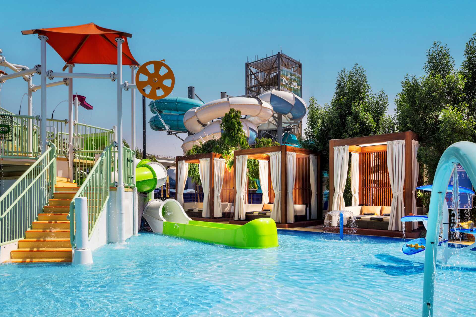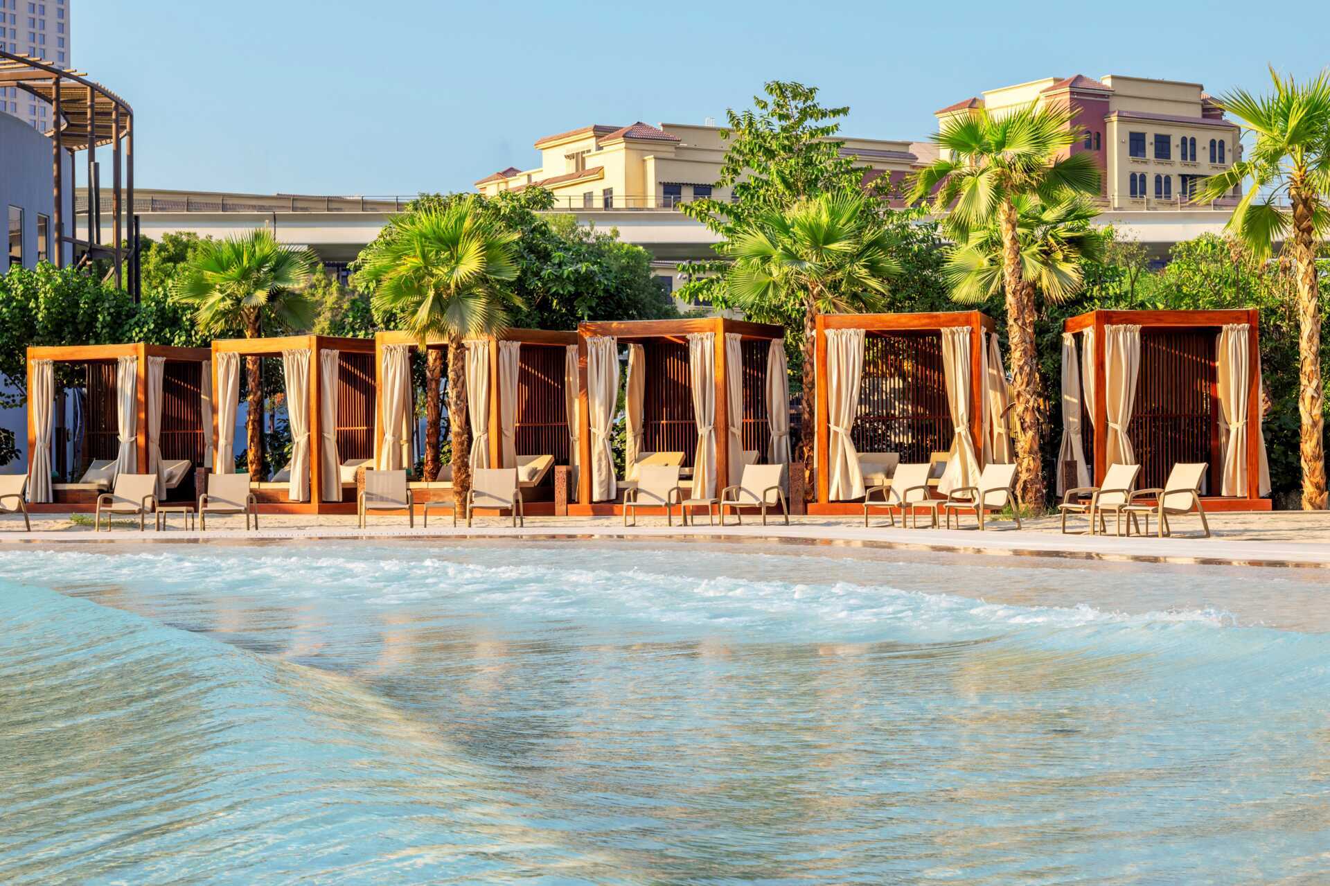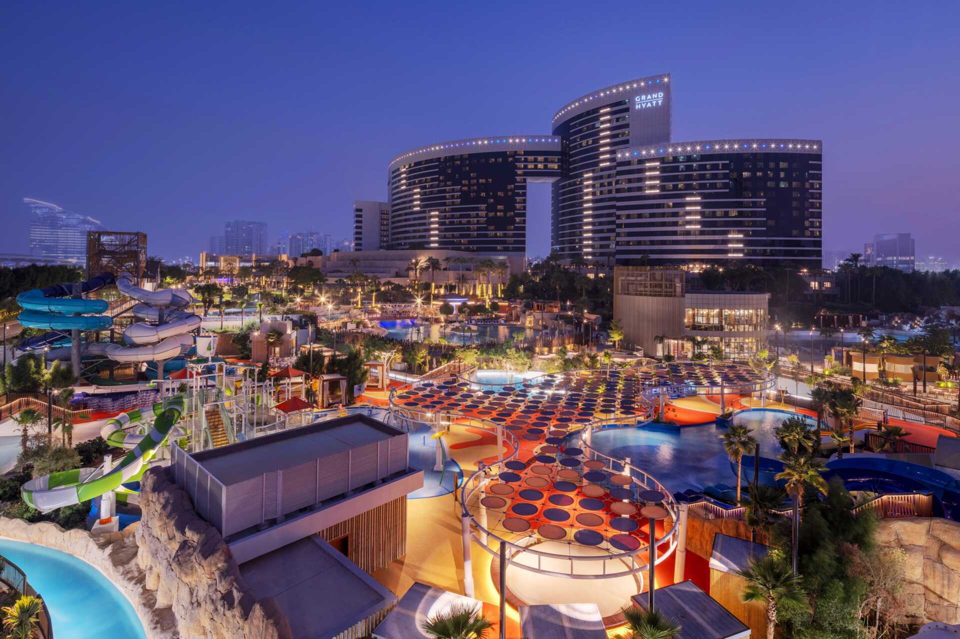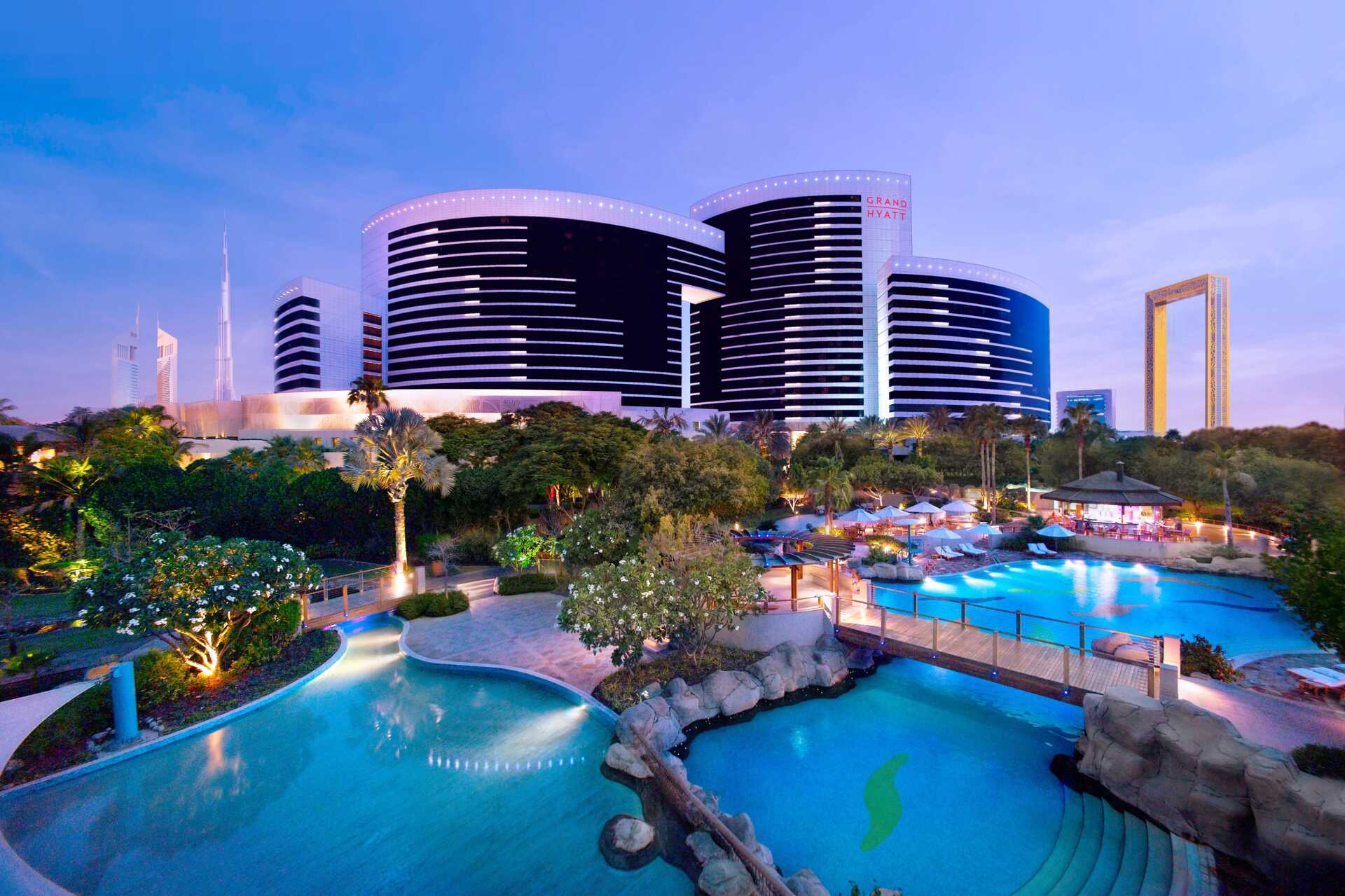 Van bovenaf gezien vormt het Grand Hyatt het woord "Dubai" in het Arabisch. Het Grand Hyatt is een indrukwekkend hotel met een groot zwembad. Drie zwembaden zijn temperatuurgeregeld, waarvan er één wordt beschouwd als een van de grootste zwembaden in Dubai. Voor de allerkleinsten is er een schaduwrijk pierenbadje. Ligbedden, parasols en badhanddoeken zijn te leen. Er is ook een binnenzwembad en daarna Vanaf 23.00 uur is het zwembad toegankelijk voor gasten ouder dan 16 jaar. Het zwembad is 24 uur per dag geopend. Het Grand Hyatt biedt ook elke dag een gratis pendeldienst van het hotel naar het openbare strand La Mer, waar veel restaurants en cafés te vinden zijn.