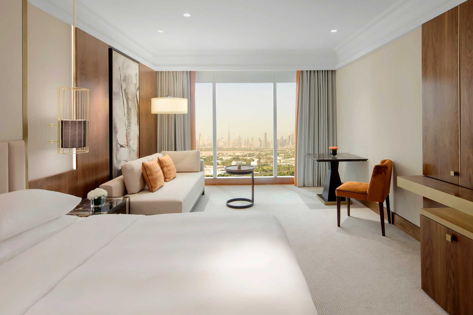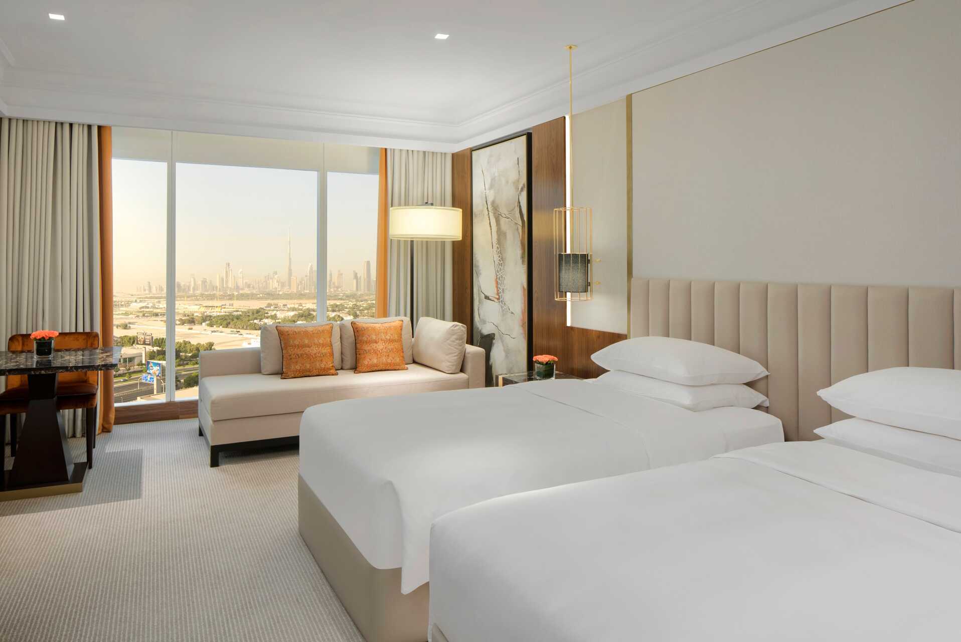 Deluxe kamers, sommige met uitzicht op de skyline van Dubai. De kamers hebben geen patio. Een tweepersoonsbed of twee eenpersoonsbedden. Mogelijkheid voor extra bedden in slaapbank. Wifi, airconditioning en kluis inbegrepen. Vloerbedekking. Minibar. Koffiezetapparaat. TV met internationale zenders. Strijkijzer en strijkplank. Föhn. Badjassen en slippers. Badkamer met bad of douche en wc. Schoonmaak 7 keer/week. Kinderen jonger dan twee jaar zijn inbegrepen in het maximale aantal personen in de kamer.