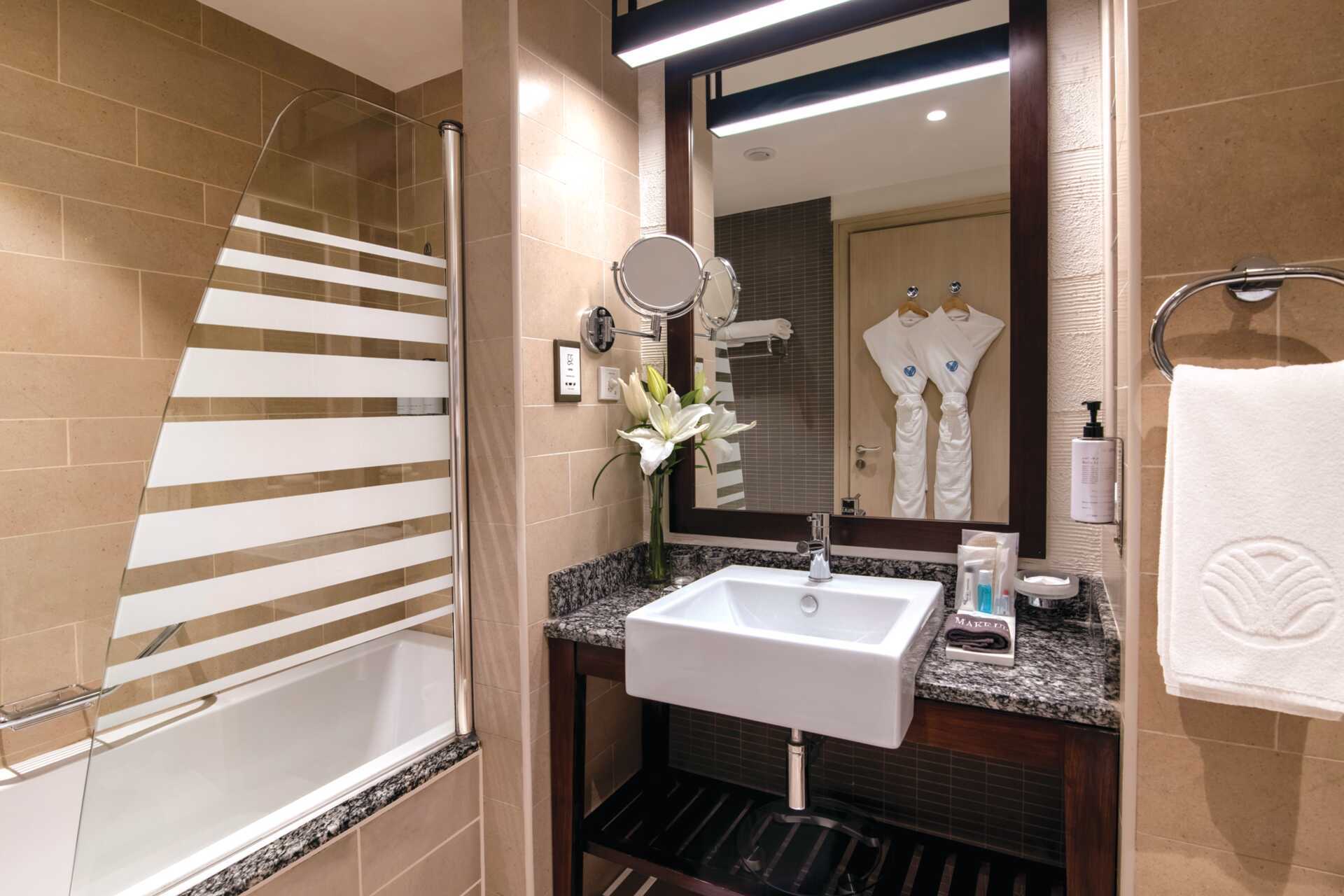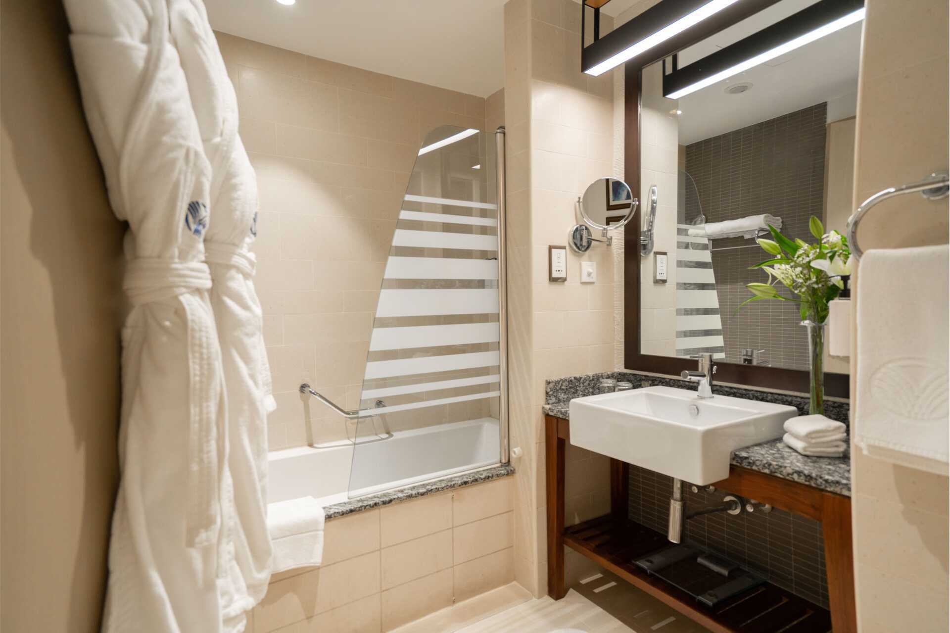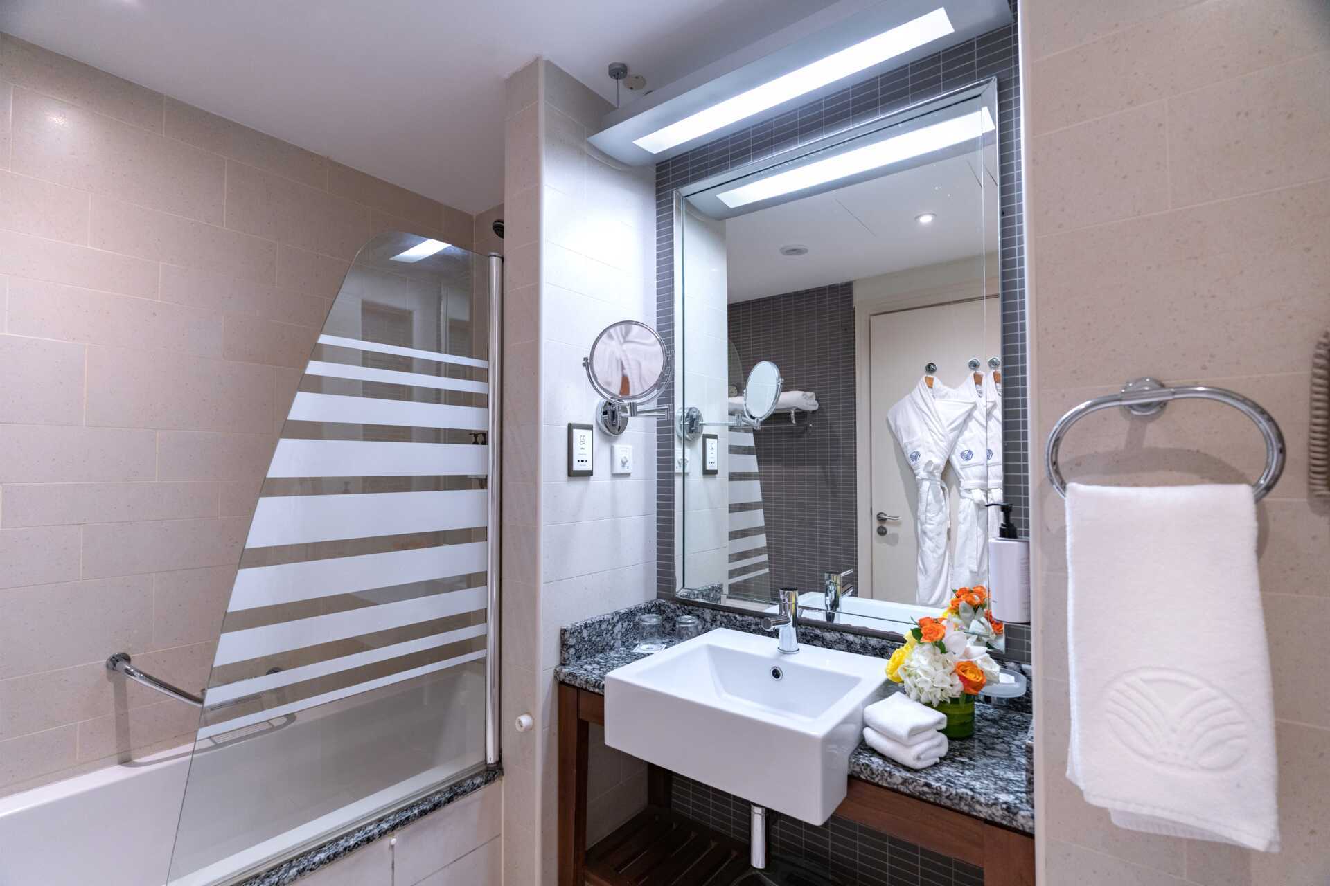 Deluxe kamer met balkon en uitzicht op Ain Dubai. Een tweepersoonsbed of twee eenpersoonsbedden. Mogelijkheid voor extra bed in eenpersoonsbed. Wifi, airconditioning en kluisje inbegrepen. Minibar. Waterkoker en koffie en thee. Badjas. Föhn. Badkamer met bad of douche en toilet. Schoonmaak 7 keer/week. Kinderen jonger dan twee jaar in het maximum aantal personen op de kamer.