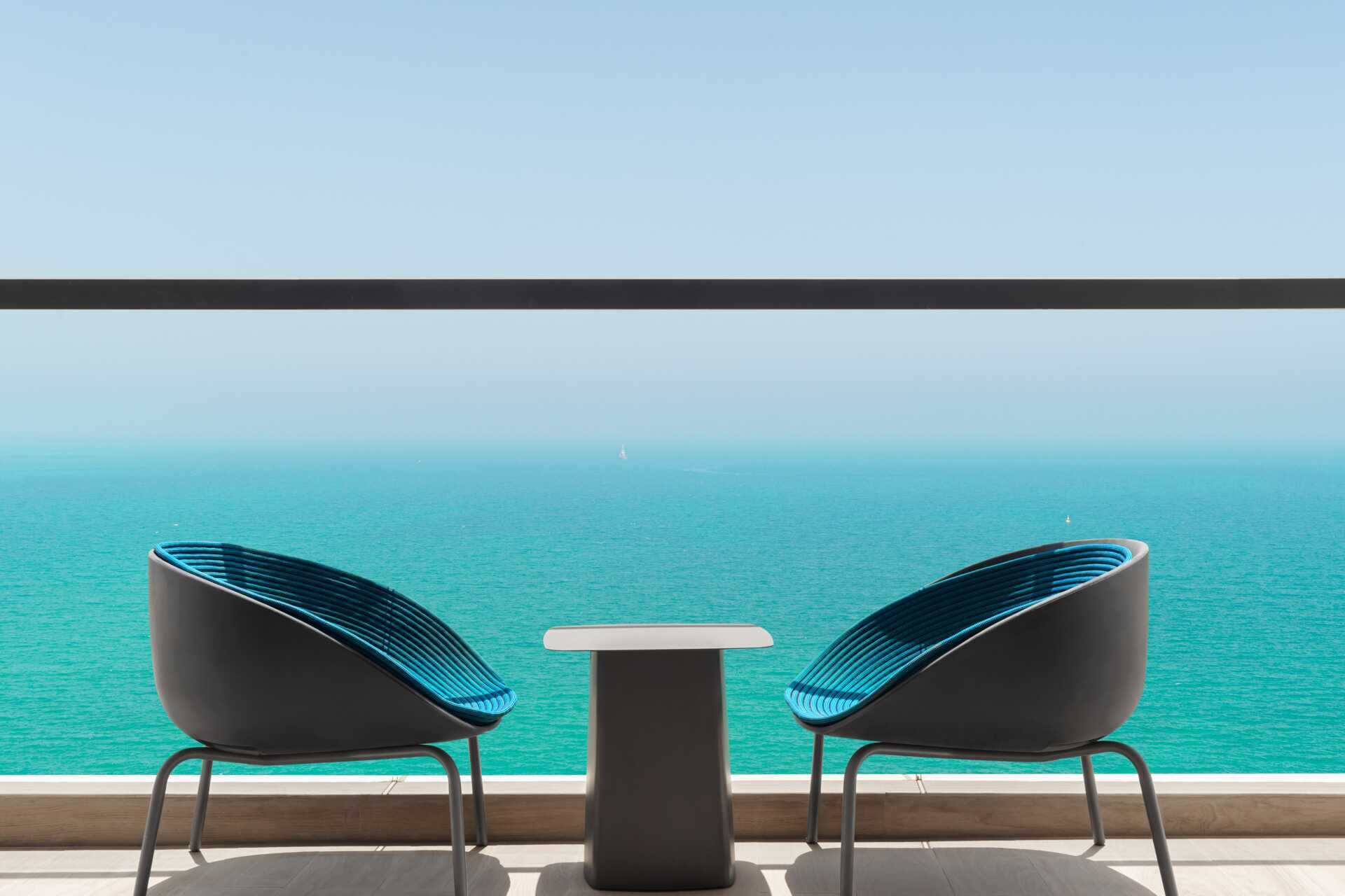 Deluxe kamer met balkon en zeezicht. De kamers bevinden zich hoog in het gebouw. Een tweepersoonsbed of twee eenpersoonsbedden. Mogelijkheid tot een extra bed in de vorm van een slaapbank, of de al aanwezige bedden. Wifi, airconditioning en kluisje inbegrepen. Koelkast. Tv met internationale zenders. Strijkijzer en strijkplank. Föhn. Badkamer met douche en toilet. Schoonmaak 7 keer/week.